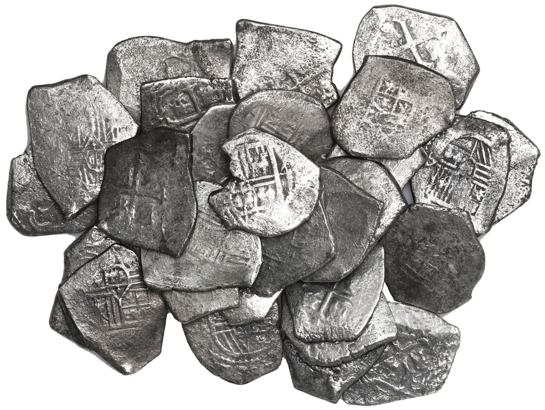 Large lot of 29 Mexico City, Mexico, cob 4 reales, Philip IV and Charles II, assayers P, G and L (where visible), ex-Katz. 324.20 grams total. All solid coins, some with a fair amount of detail including visible assayers, one with canvas bag imprint. Pedigreed to the Estate of Wallace Katz. Recovered from: Joanna, sunk in 1682 off South Africa.
