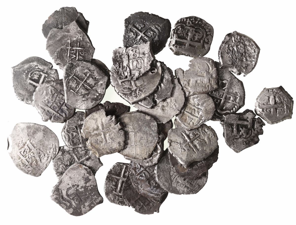 Large lot of 33 Potosi, Bolivia, cob 1R: 1655E, 1656E, 1662E, 1665E, 1666E, 1667E, 1689VR, 1698F (2), 1700F, 1701F, 1709Y (2), 1710Y, 1713Y, 1714Y (3), 1716Y, 1719Y, 1722Y, 1723Y, 1740M, 1742P, 1754C, 1755q, 1758q, 1759q, 1760(V-Y), 1763(V-Y), 1765(V-Y) (2), and 1766(V-Y). 102.58 grams total. Fine on average, most with clear dates and most with toning, only one holed, a few salvaged, all with at least partial cross and pillars.