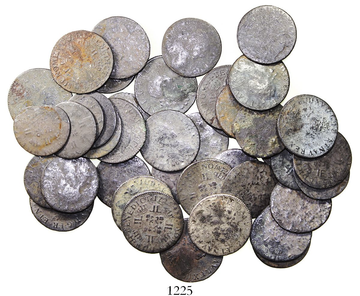 Large lot of 41 French ecus, various dates and mints where visible. 624 grams total. Some fairly solid but most heavily worn and corroded, all dark as uncleaned, some with light sheen of encrustation, all very typical for this wreck. Recovered from: Le Chameau, sunk in 1725 off Nova Scotia, Canada