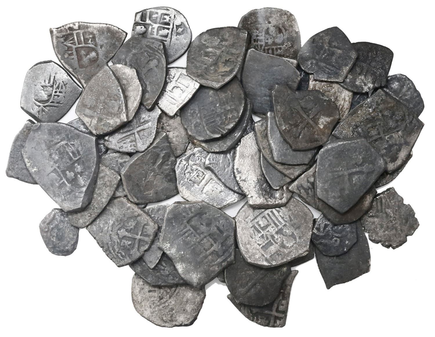 Large lot of 60 Mexico City, Mexico, cob 2R (11), 1R (41) and 1/2R (8), Charles II and Philip V, assayers not visible. 192.23 grams total. All uncleaned and dark but with mostly good details and solid, great lot for anyone who wants to clean his own coins and then mount them in jewelry! Recovered from: Spanish 1715 Fleet, east coast of Florida