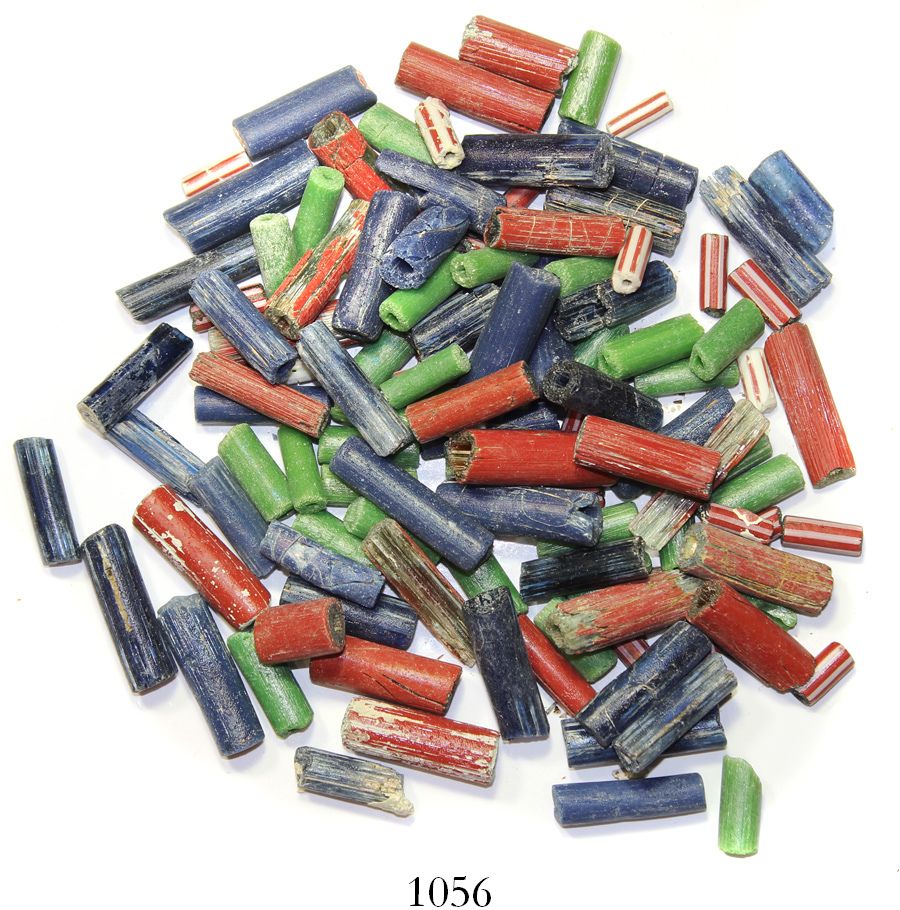 Large lot of Venetian glass trade beads, multiple colors and designs. 245 grams total, each about 1/2" to 1" long. The inbound early wrecks in the Caribbean (as well as some land sites) tend to be littered with these beads, which were generally traded to the natives and therefore were a sort of money, this batch consisting of cylinders of blue, green and red, some striped like candy, whose method of manufacture is (and was) similar. From an unidentified 1500s-1600s wreck off Santo Domingo, with Global Marine Exploration photo-certificate. Recovered from: Unidentified 1500s-1600s wrecks off Santo Domingo
