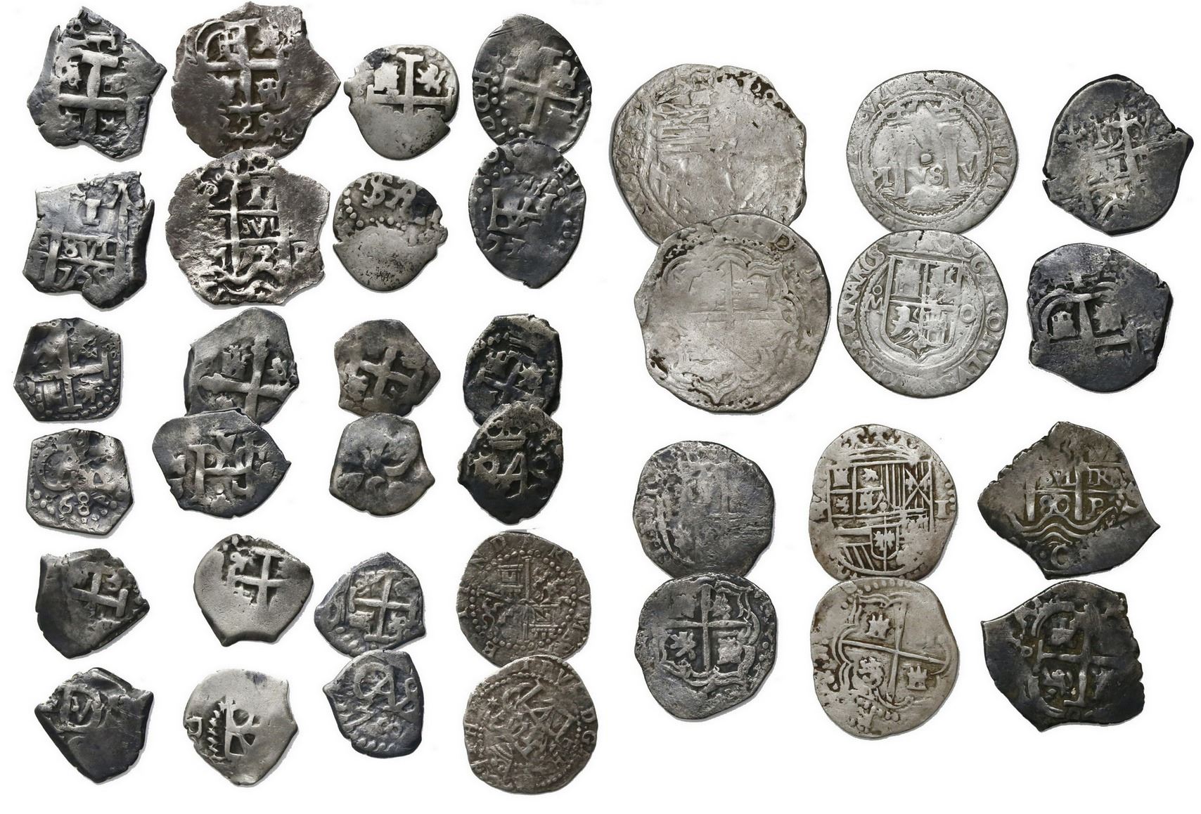 Large lot of eighteen Spanish colonial cob minors (2, 1 and 1/2R) of Mexico (2), Lima (4) and Potosi (12). 40.50 grams total. Fine on average, all toned, mostly clear details, nice mix of different types, including Charles-Joanna "Late Series," shield-type and dated pillars-and-waves. SEE INTERNET FOR PHOTO.