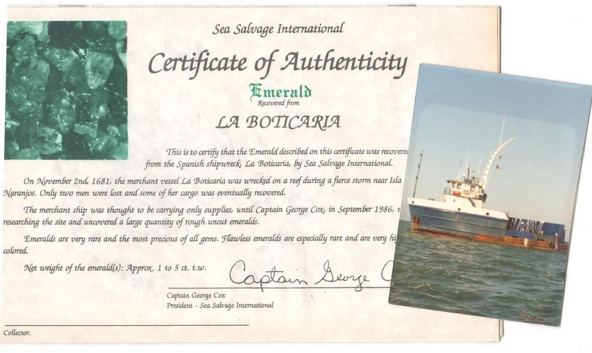 Large lot of hundreds of natural emeralds (43.5 carats total), found in 1986. From tiny chips to big 1/2" crystals, in a wide range of color and opacity, these emeralds are precisely what you see individually tagged from the Atocha but from a much smaller and less organized salvage effort on a relatively obscure wreck, this lot intended to be promoted by the (now deceased) finder but now a great opportunity for the high bidder. With certificate and booklet about the salvage of this wreck in 1986 (also a photo of the salvage vessel). Recovered from: 1681 Fleet off Panama (Boticaria site)