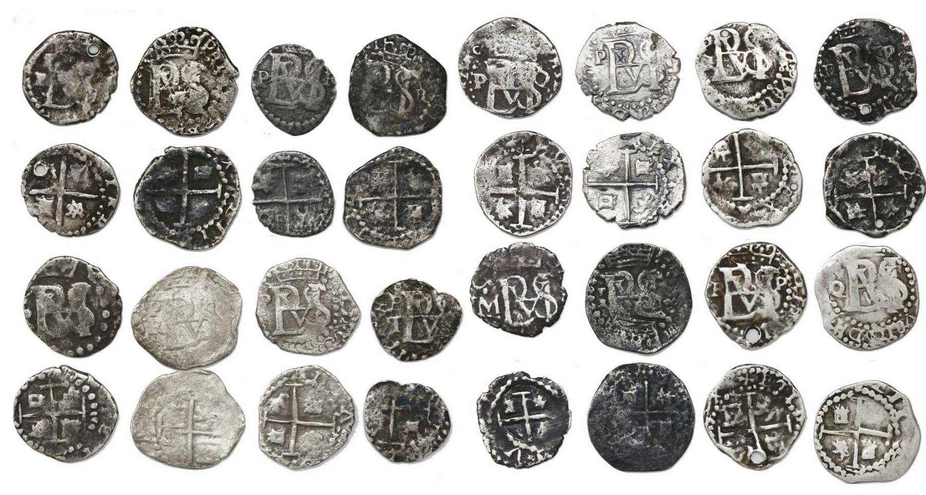 Large lot of sixteen Potosi, Bolivia, cob 1/2R, Philip III and IV, assayers R, Q, M, T and no assayer. 20.96 grams total. Three holed, some corroded, but great for study as each one is a different assayer and/or variety, the Q left (Paoletti Plate Coin) and P-Q left (missing in Sellschopp and Karon) particularly rare, overall Fine or better with generally full crosses and monograms, mostly toned. Various pedigrees from the 2000s, including: Goldberg #41 (lot 3005), Heritage #458 (lot 50234) and Ponterio #111 (lot 530), as well as our Auctions (all with original lot-tags) #5 (lot 751), #8 (lot 771, ex-Consolacion [1681], with ROBCAR certificate) and Internet-Only Auction #1 (lot 286). SEE INTERNET FOR PHOTO.