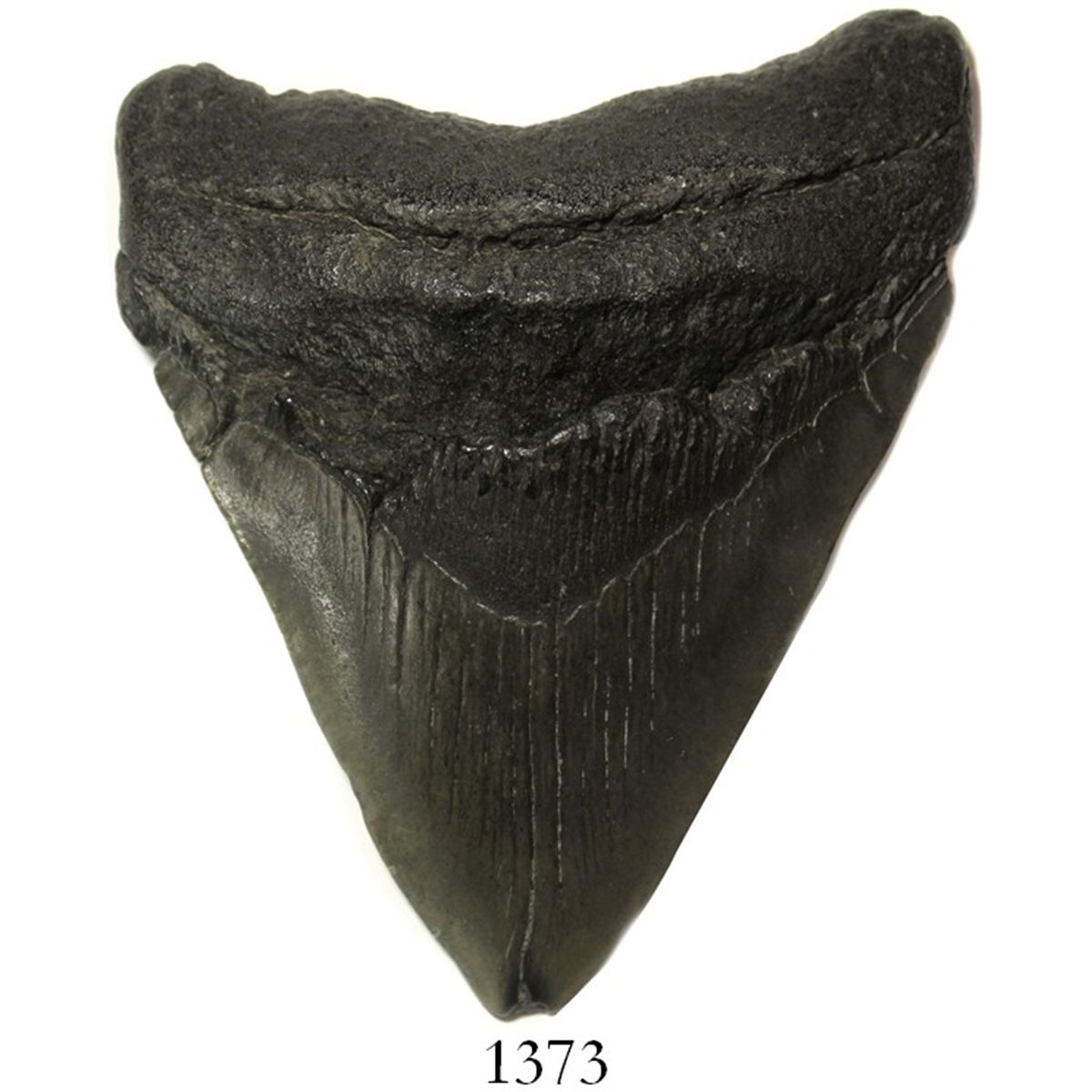 Large megalodon tooth (black), 25 million years old, found off South Carolina. 214 grams, approx. 4-1/2" x 3-3/4" x 1". Uncommonly intact, with just a little wear around the edges and with void in the dark root, but impressive in size, especially when you consider what a whole mouth full of them must have looked like!