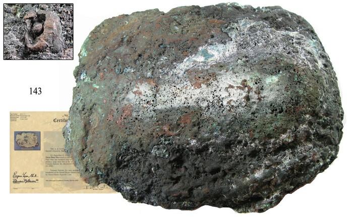 Large, mounded copper ingot from the Atocha (1622). 32 lb av, roughly 11" x 9" x 4". A very dense, thick "pig" of copper, with curiously ear-shaped blob on top (partially unmelted artifact?), one of many found on the Atocha and distributed to investors far and wide who tend to use them as doorstops and subsequently lose the all-important Fisher certificate (present with this example). From the Atocha (1622), with Fisher photo-certificate #85A-131-1.