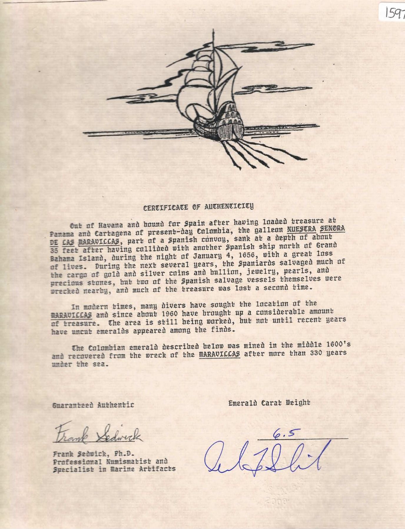 Large natural emerald, 6.5 carats, ex-Maravillas (1656). Roughly ¾" x ½" x ¼". A big green rock, very dark and not too "washed out," with some brown on the side that appears to be encrustation but could be crystal matrix, not gem quality but a valuable artifact. From the Maravillas, with hand-signed certificate from Frank and Daniel Sedwick, and pedigreed to Sedwick Auction 3, with original lot-tag 978.
