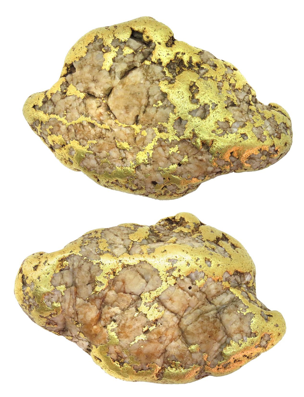 Large, natural gold nugget from Alaska, 484 grams, approx. 76% fine (est. 11.83 oz AGW), nicknamed "The Big Cheese." Approx. 3½" x 2" x 1". A sizable lump with smooth surfaces from eons of river-tumbling, slightly triangular in shape, with lots of quartz remaining on the exterior (looks like a giant cheese curd), making it seem like there is more quartz than there really is, but heavy in hand and very nice for display. Note: At $3400/oz spot price, assuming at least 99% of the weight is gold and not quartz, this nugget melts at around $39,800.