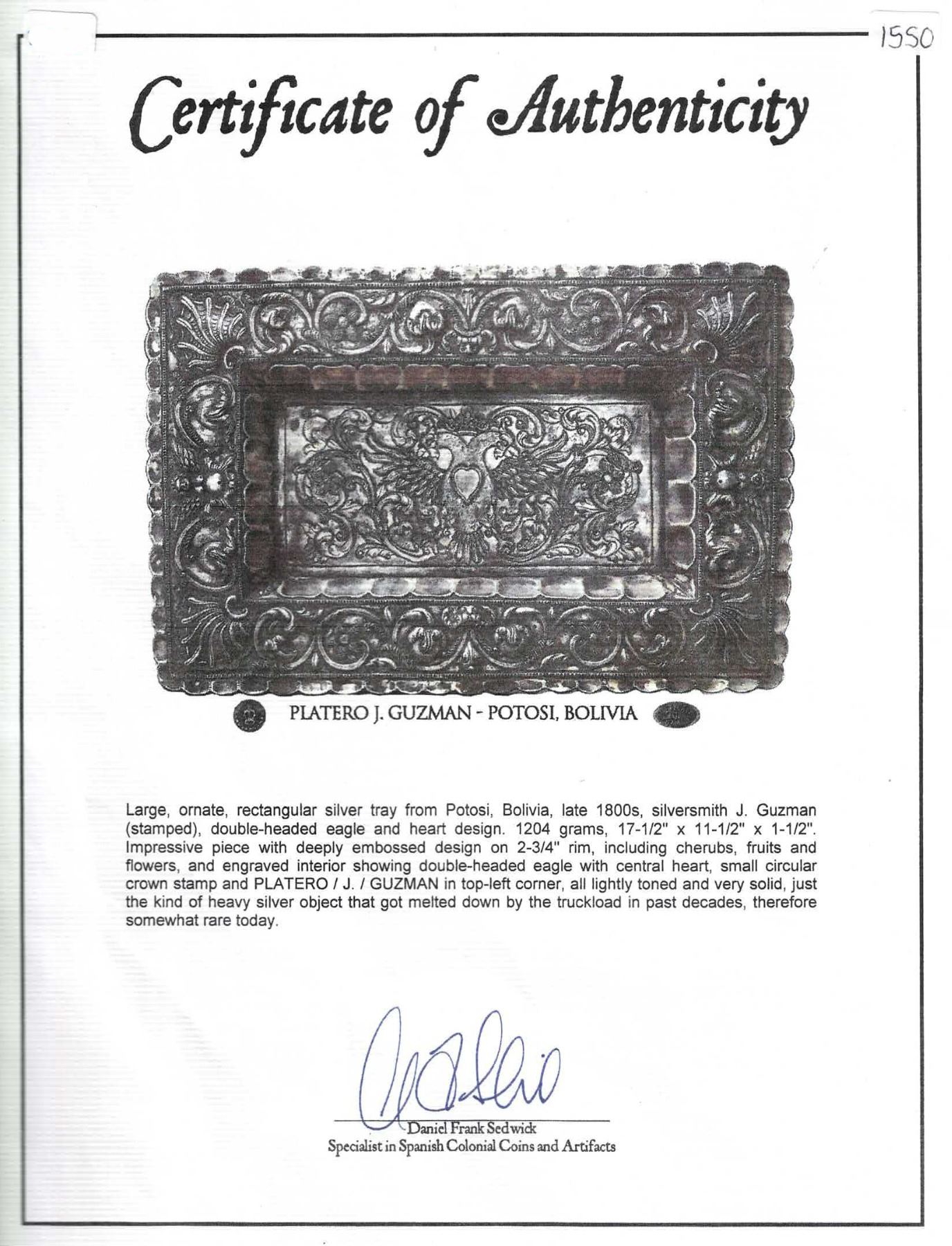 Large, ornate, rectangular silver tray from Potosí, Bolivia, stamped by silversmith J. Guzman (late 1800s), double-headed eagle and heart design. 1204 grams. 17½" x 11½" x 1½". Impressive piece (XRF tested at 94.2% silver) with deeply embossed design on 2¾" rim, including cherubs, fruits and flowers, and with engraved interior showing double-headed eagle with central heart, small circular crown stamp and PLATERO / J. / GUZMAN in top-left corner, all lightly toned and very solid, just the kind of heavy silver object that usually got melted down in past decades, therefore somewhat rare today. Pedigreed to Sedwick Auction 20, with original lot-tag 1692 and Sedwick photo-certificate.