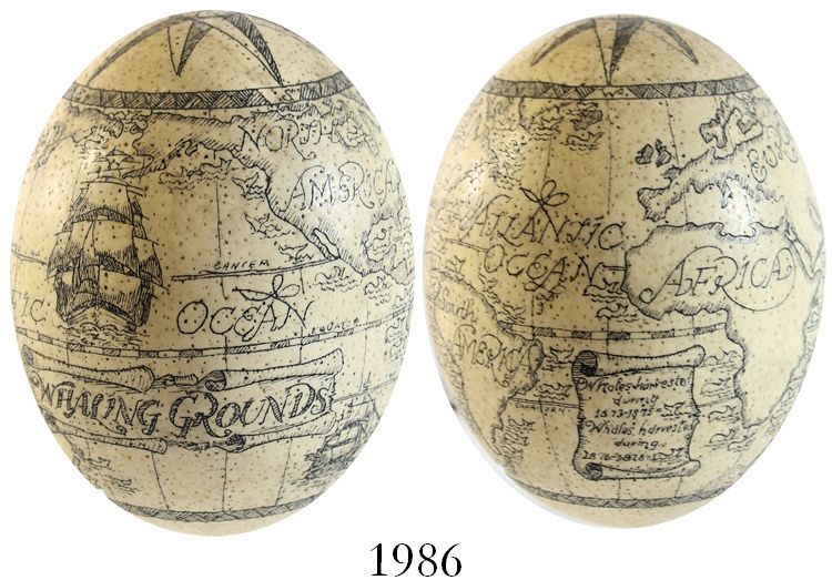 Large ostrich egg with (modern) scrimshaw showing two voyages with locations of whales caught in the 1870s. 264 grams; about 6" tall and 4-1/2" in diameter. A beautiful display consisting of a genuine egg (hollowed out via a hole in the bottom) with intricate engraving done in modern times on the whole surface, showing an entire world map entitled "Whaling Grounds" that looks old but can be seen on other modern items as well. Housed in glass case.