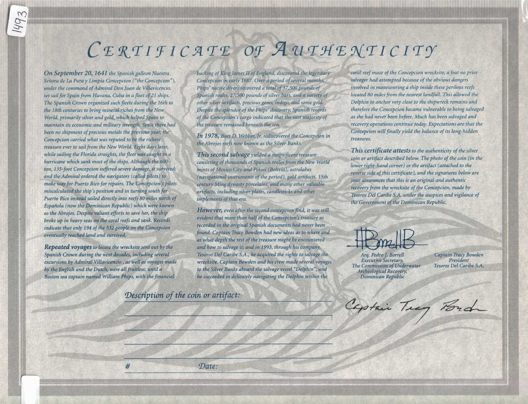 Large pewter platter, ex-Concepción (1641). 835 grams. 12" in diameter, 1¾" deep. Perhaps a serving platter due to its size, with a raised rim, intact with spots of corrosion mostly in the bottom, matte gray coloring all over. From the Concepción (1641), with original certificate from Captain Tracy Bowden through his contract with the Dominican Republic, and accompanied by the July 1996 issue of National Geographic signed by Captain Tracy Bowden on his article "Gleaning Treasure from the Silver Bank."