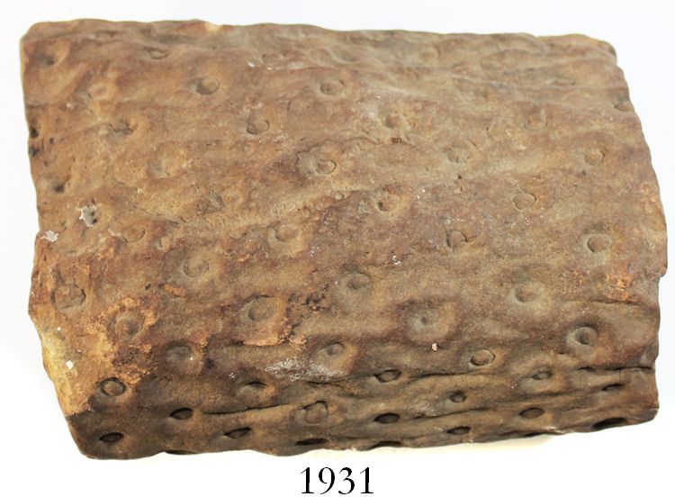 Large plant fossil, Lepidodendron, approx. 300 million years old (Carboniferous period), place of origin uncertain. 2038 grams; 6" x 4-1/2" x 2-1/2". This is basically a section of the trunk of an extinct type of tree, still brown in color but rock-hard from fossilization, with ridged texture and small pits all over (like a cactus), all curled around a hollow center.