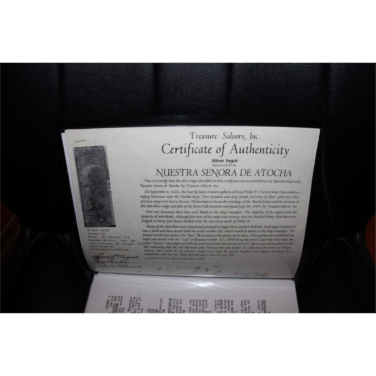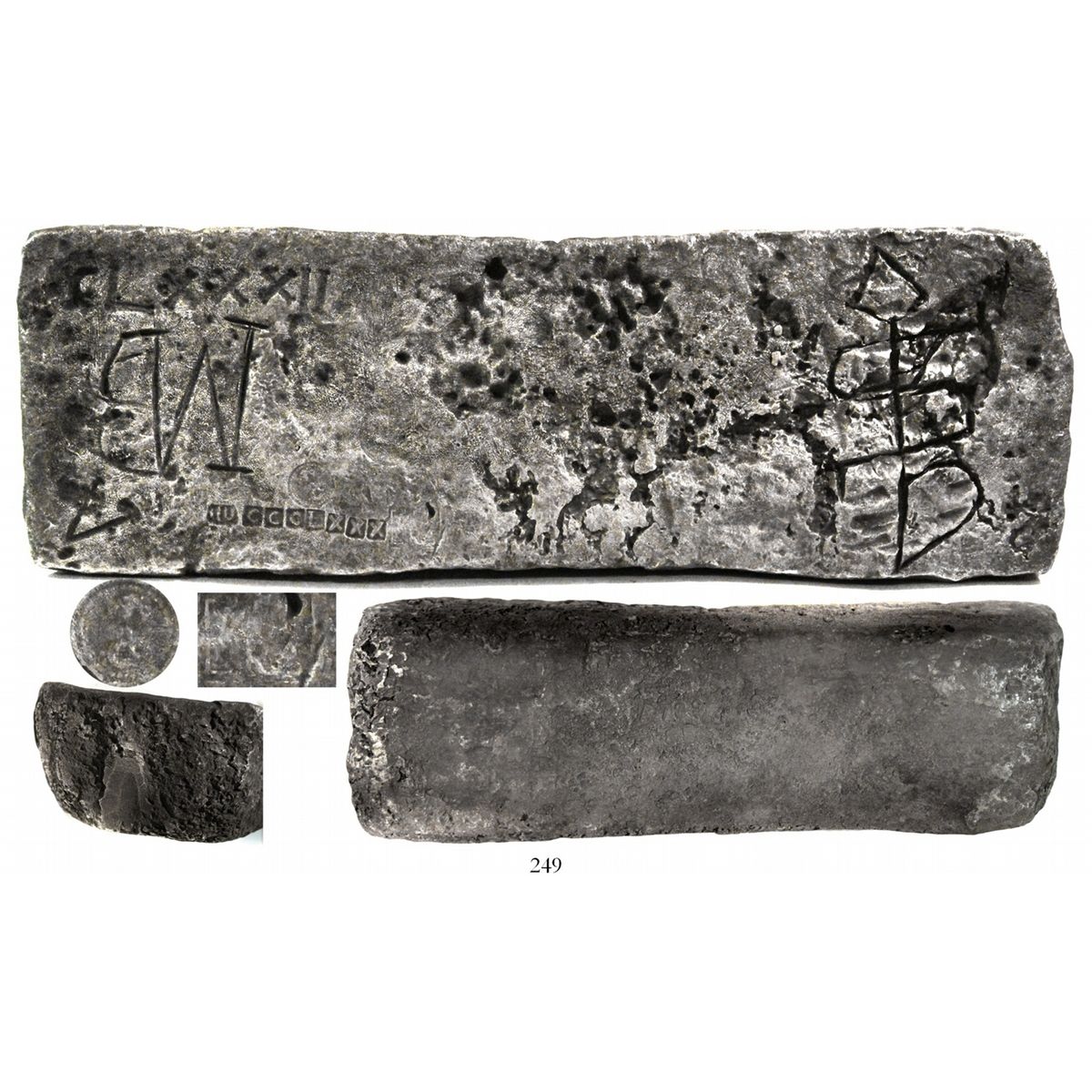 Large silver bar #182, 90 lb 0.32 oz troy, Class Factor 0.7, with special certificate. Approx. 15-3/4" x 5" x 3". Interesting Oruro (foundry) ingot with owner/shipper marks re-stamped in a crudely remelted area (not corrosion, as it might seem at first), which is somewhat normal for this foundry, also with full circular stamp with crown above O (looks like what we see on the 1649-1652 Potosi coinage) above bold fineness IIUCCCLXXX (2380/2400) to left of faint (unattributed) assayer cartouche that includes letters LRA, incuse manifest number CLXXXII (182), traces of cylindrical assayer's "bite" in corroded area on side at one end. In short, this is every bit of a Class Factor-0.9 bar (lacking only the date), but the re-melting was confused for heavy corrosion. From the Atocha (1622), with original Fisher certificate, plastic tag and packet of manifest information.
