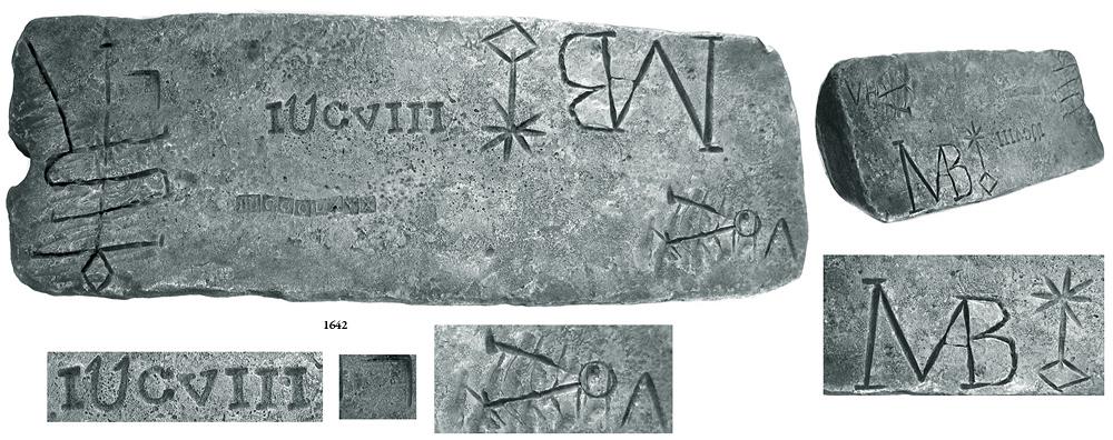 Large silver bar from the Atocha (1622), 83 lb 9.44 oz troy, Class Factor 1.0. About 16" x 5-1/4" x 3-1/4". A curious example of crossed-out markings, as the monogrammed TSR to right is defaced and replaced on the left side (below a crossed-out V) with a bold MB monogram (shipper/owner Munibe), also with bold manifest number I11CVIII (note the 1's instead of I's) and fineness IIU C C C L X X X (2380 = 99.2% pure), also partial tax stamp and date or assayer cartouche, very prominent cylindrical assayer's "bite" at one end (hence cast in Oruro, which is scarcer than Potosí), minor surface corrosion, desirable pedigree. From the Atocha (1622), with Fisher photo-certificate #85A-S811. Also pedigreed to the Treasures of the Nuestra Senora de Atocha auction (San Diego, 9/19/87), lot #3374.