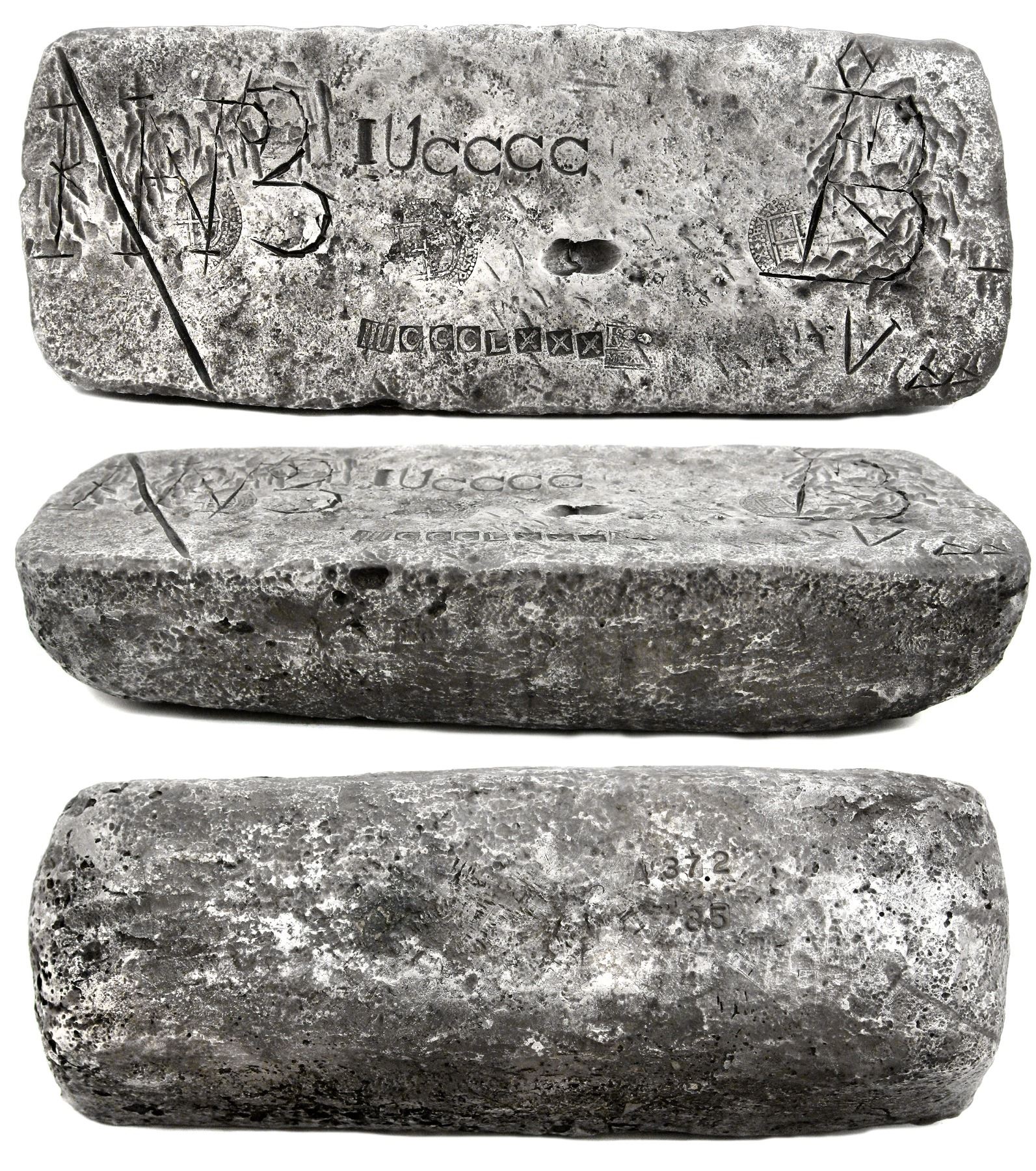 Large silver ingot #372 made in Potosi, 81 lb 11.04 oz troy, Class Factor 1.0, marked with fineness IIUCCCLXXX (2380/2400, 99.17% fine), manifest number IUCCCC (1400), assayer MEXIA, tax stamps and owner/shipper marks, ex-Atocha (1622). 14" x 5-1/2" x 3-1/2". Boldy marked bar with both large owner/shipper marks (one at each end) apparently partially erased by hammering, one of them also covered by a heavy diagonal slash and partially covering a faint date cartouche showing the bottom of 62 only, the fineness and MEXIA assayer cartouche quite clear below the double-scoop assayer's "bite," three circular tax stamps, small V for silvermaster de Vreder near one corner, bold and succinct manifest number near center, only minimal surface corrosion. From the Atocha (1622), with original Fisher photo-certificate #85A-S372, plus booklet The Treasure of 1622, hand-inscribed by Mel Fisher on the title page "Hang in there, Stephen, Mel Fisher" and by Kane Fisher on page 9 "To Steve, May you find your own Treasure in Life! Capt Kane Fisher."
