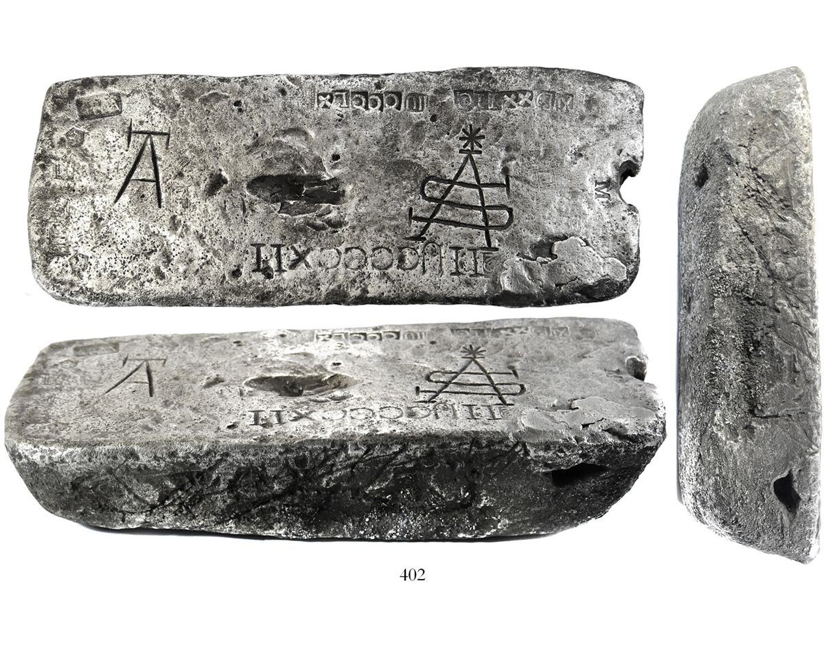 Huge "loaf" of silver with bold markings of manifest number IIUCCCXII (2312) next to date-cartouche (165)2, fineness IIUCCCLX with weight XID XXIIG (11 dineros, 22 granos) next to that and assayer cartouche to the other side, owner/shipper marks (monograms) TA and *AS, large scoop-style assayer's "bite" in center plus cylindrical one on the edge (which means this was an Oruro bar that was re-assayed in Potosi) next to a silvermaster mark M, various other cartouches at other end, with light corrosion only and with interesting encrustation on all but the top side (also an interesting void in one side, probably where embedded charcoal burned away), very impressive and important as one of very few large ingots ever offered from this wreck