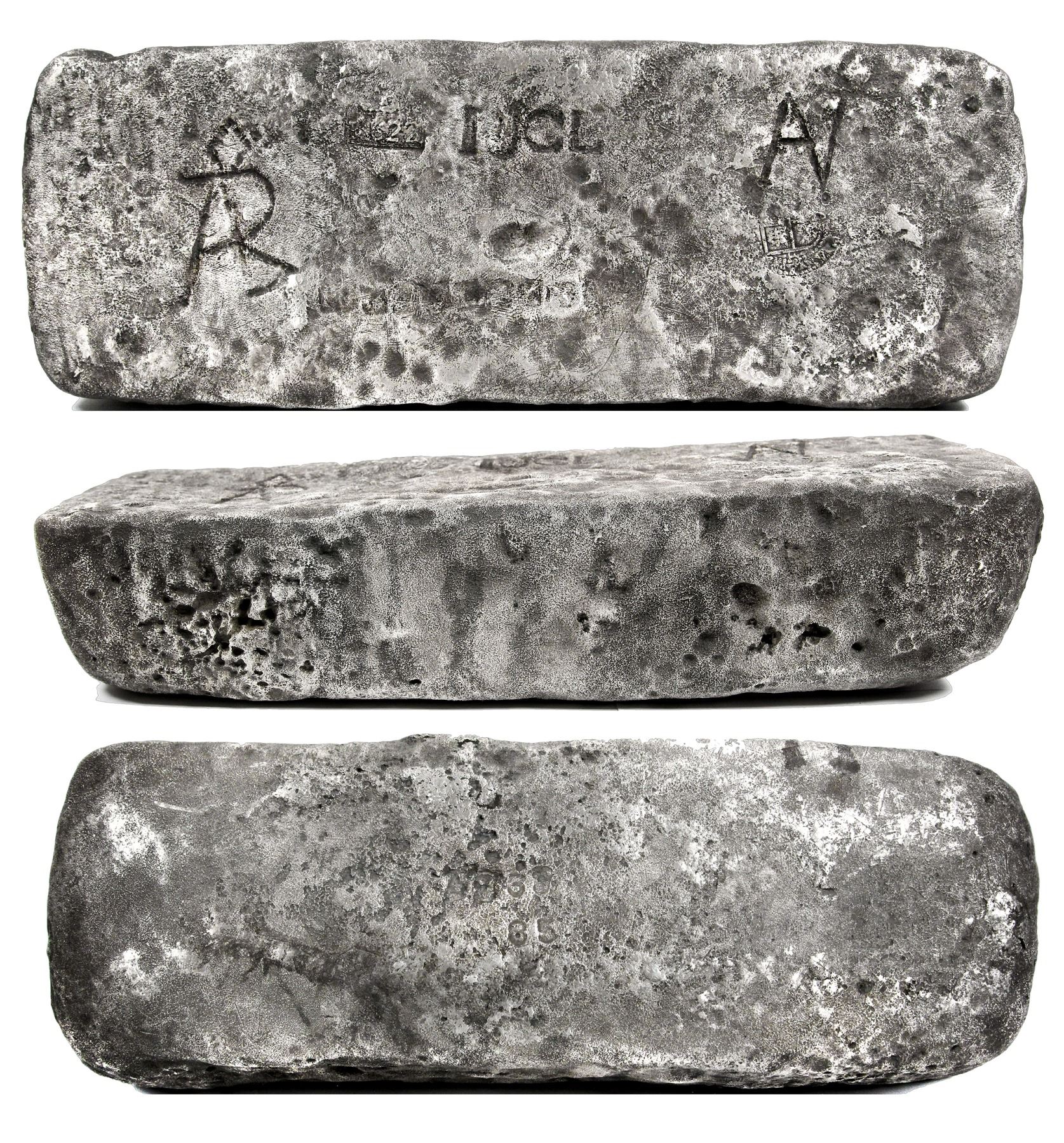 Large silver ingot #763 made in Potosi, 75 lb 3.04 oz troy, Class Factor 1.0, marked with fineness I