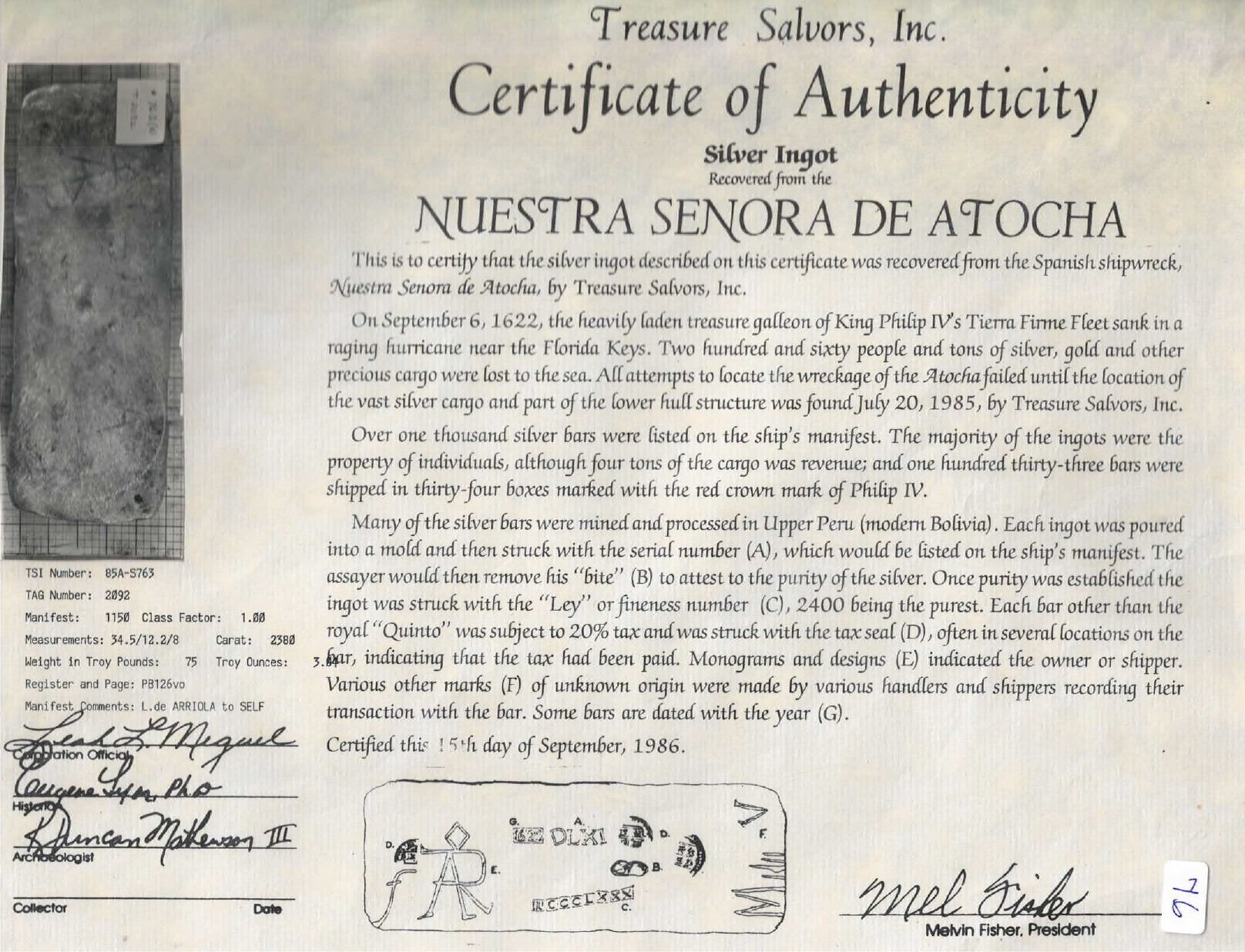 Large silver ingot #763 made in Potosi, 75 lb 3.04 oz troy, Class Factor 1.0, marked with fineness IIUCCCLXXX (2380/2400, 99.17% fine), date 1622, manifest number IUCL (1150), assayer MEXIA, tax stamps and owner/shipper marks, ex-Atocha (1622). 13-1/2" x 5" x 3-1/2". Slightly smaller bar with particularly strong date cartouche (full 1622), clear diamond-topped AR monogram for owner/shipper Arriola but also a clear AV monogram near the other end, shallower-than-usual assayer's "bite" (because it's a smaller bar) in center, at least one clear tax stamp, the fineness weaker but still clear, probably V for silvermaster de Vreder in one corner but all somewhat corroded all over. From the Atocha (1622), with original Mel Fisher photo-certificate 85A-S763.