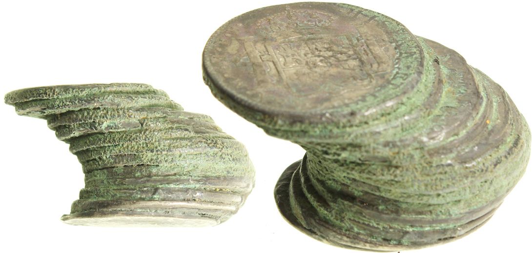 Large, tilted stack of 12 Spanish colonial bust 8R of Charles III with green encrustation all over (as found). 304 grams. Mostly solid coins but with worn edges, the bottom coin with nice reverse visible, the top coin with worn obverse, darkly toned, with attractive green encrustation on sides. Recovered from: Cazador, sunk in 1784 off New Orleans in the Gulf of Mexico