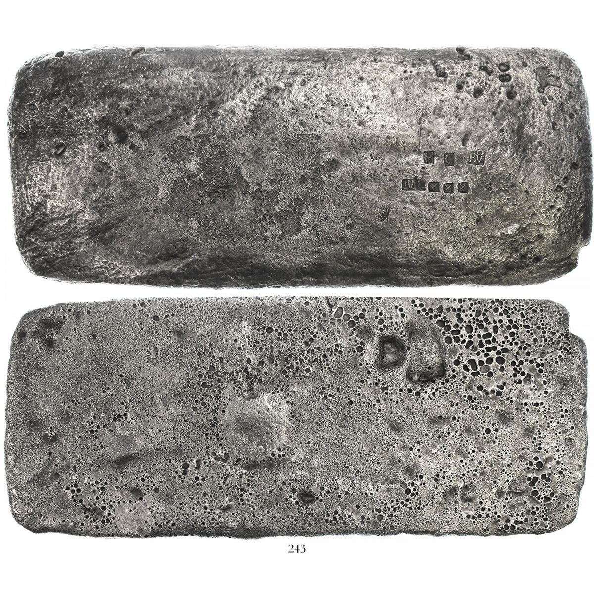 Large "tumbaga" silver bar #M-101, 12.6 lb av, marked with fineness IVLXXX (1530/2400), owner B~Vo, and partial tax stamp, partially plated in Armstrong's book. 13-1/2" x 5-3/4" x 3/4. A flat, wide, rectangular ingot with relatively smooth, even surface on marked bottom (just a tiny bit of corrosion), the other side with thousands of tiny popped bubbles from the casting process, lightly toned all over, prominent assayer's "bite" in one corner, a well-marked bar of impressive size from the earliest known New World bullion to survive. From the "Tumbaga" wreck (ca. 1528), with original Sedwick photo-certificate from 2002.