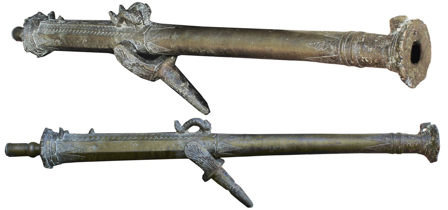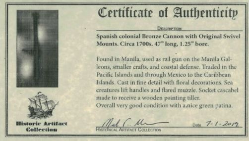 Late-1700s / early-1800s Dutch East Indies bronze lantaka cannon with original yoke. About 70 lb, 47" long, 1-1/4" bore. Nice-sized cannon for display, as it is big enough to impress yet light enough to lift, found in Manila and traded throughout the Pacific and Caribbean, cast in fine detail with floral decorations, dolphin lifting handles, flared muzzle, socket cascabel which was made to receive a wooden pointing tiller, green patina and light encrustation throughout. With photo-certificate.