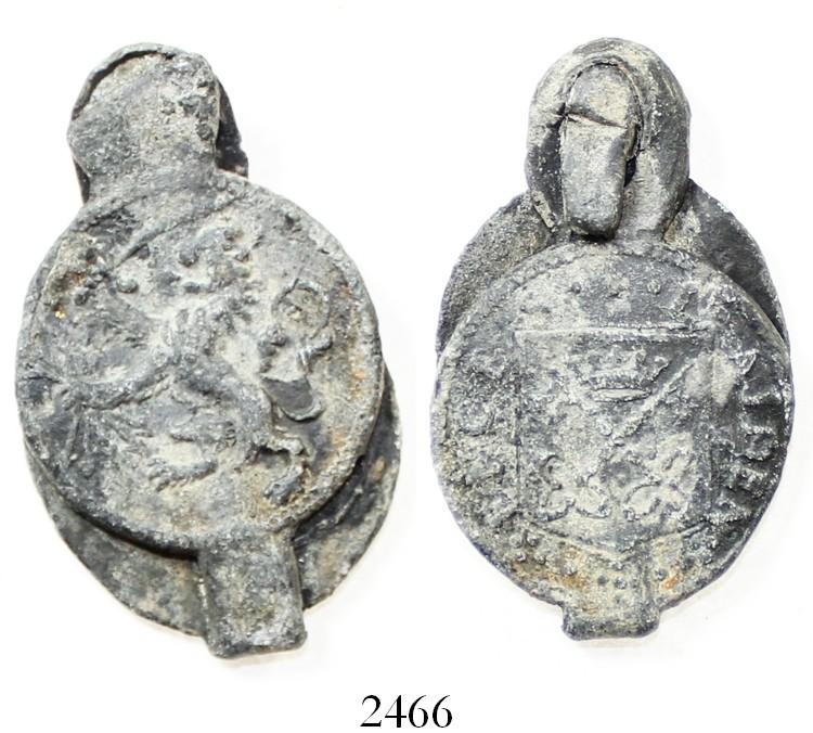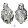 Lead textile seal (complete). 14 grams, 1-5/8" x 1". Full seal with arms on each side (one a big, sword-wielding lion), connector strips intact, reportedly found on the beach in the area of Corrigans wreck. From the Spanish 1715 Fleet, east coast of Florida.