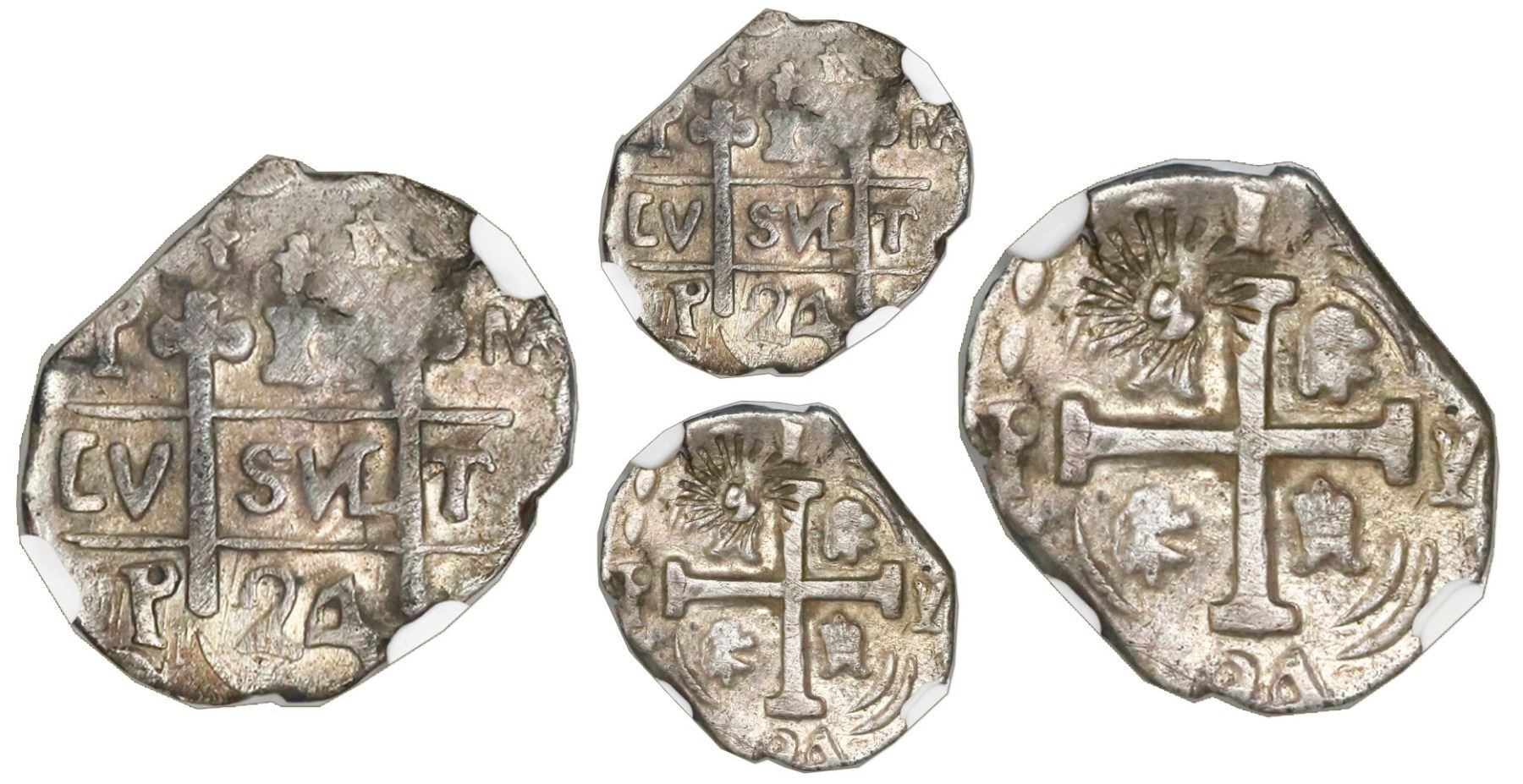 Leon, Nicaragua, liberty cap countermark (1824-5) on a Tegucigalpa, Honduras, provisional "imitation cob" 1 real 1824-PMPY with backwards lions, very rare, NGC XF 45, c/s XF standard, ex-Richard Stuart (stated on label). KM-unl. 3.14 grams. Full countermark (low contrast) on cross side, the host with semi-lustrous surfaces and golden toning, full pillars and cross, two dates. Pedigreed to the Richard Stuart collection. NGC #4660732-012.