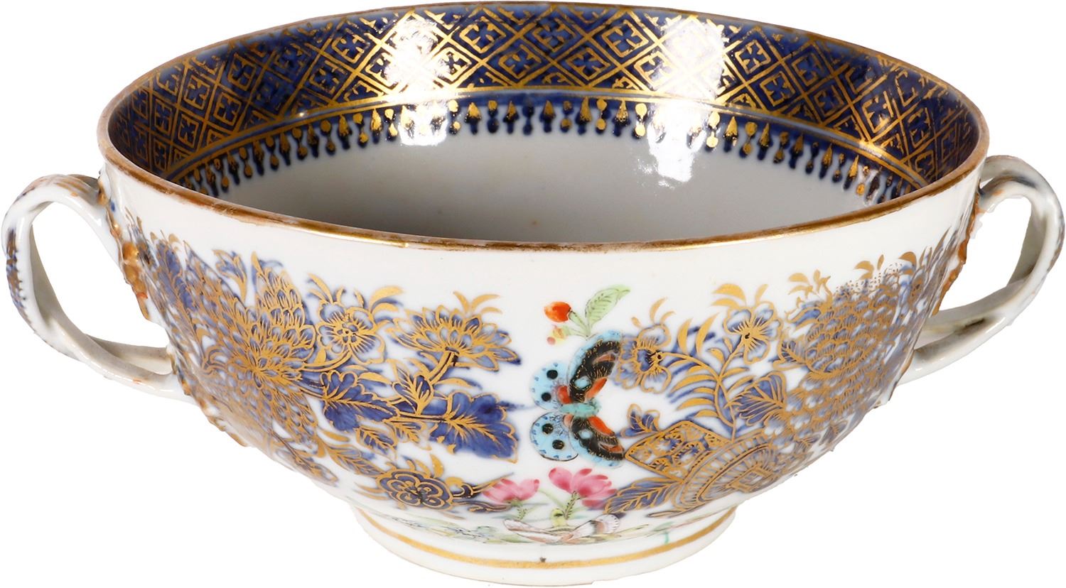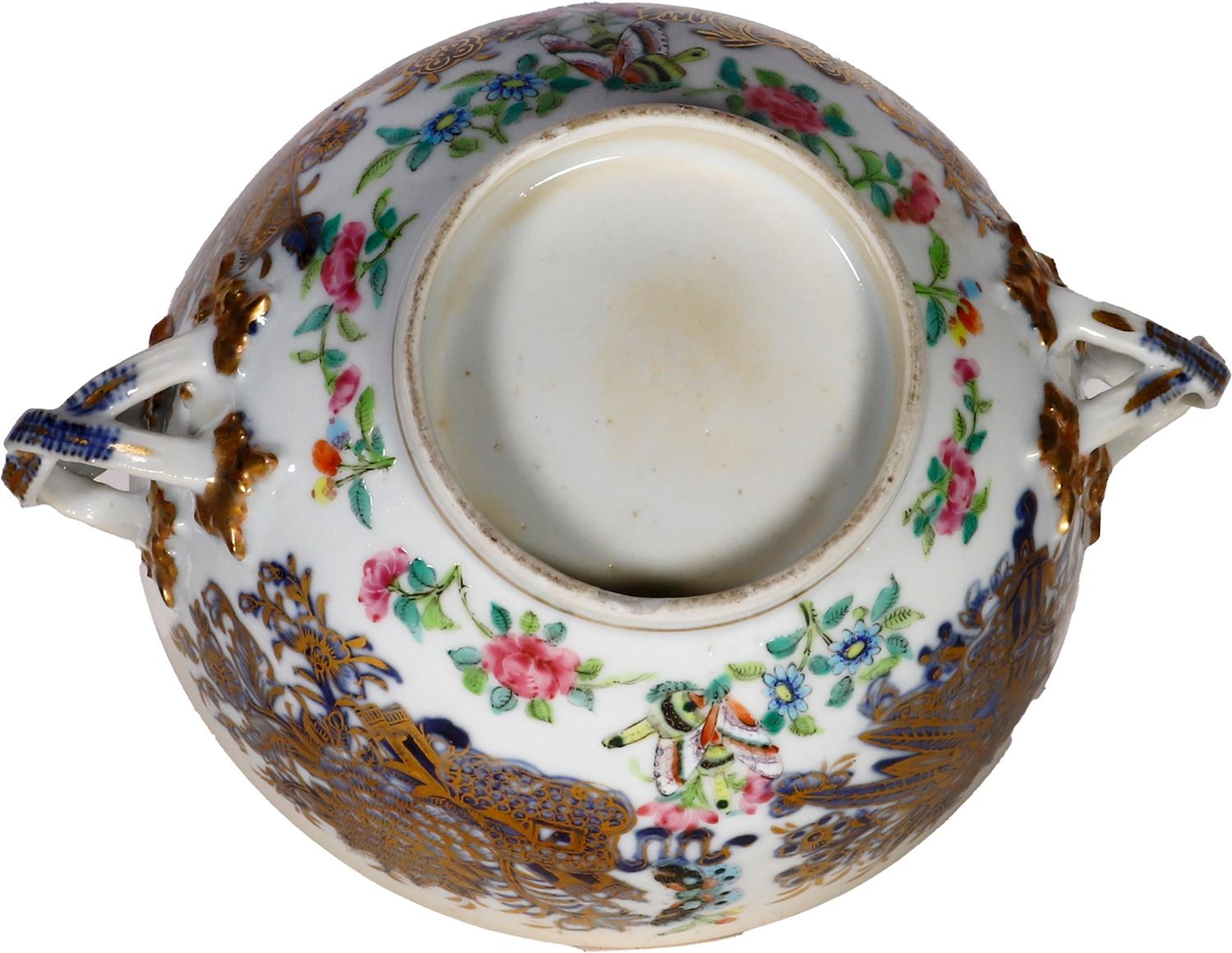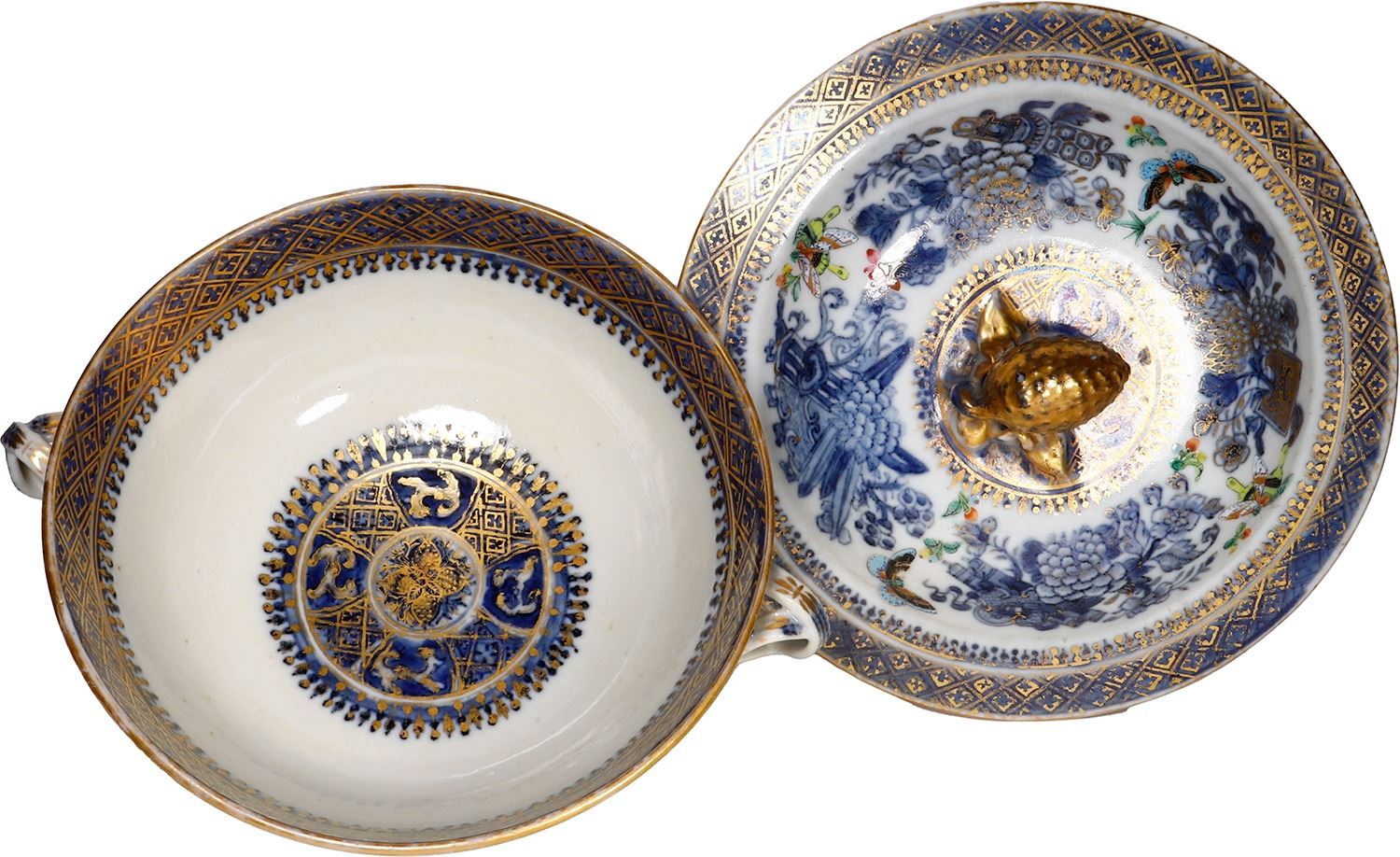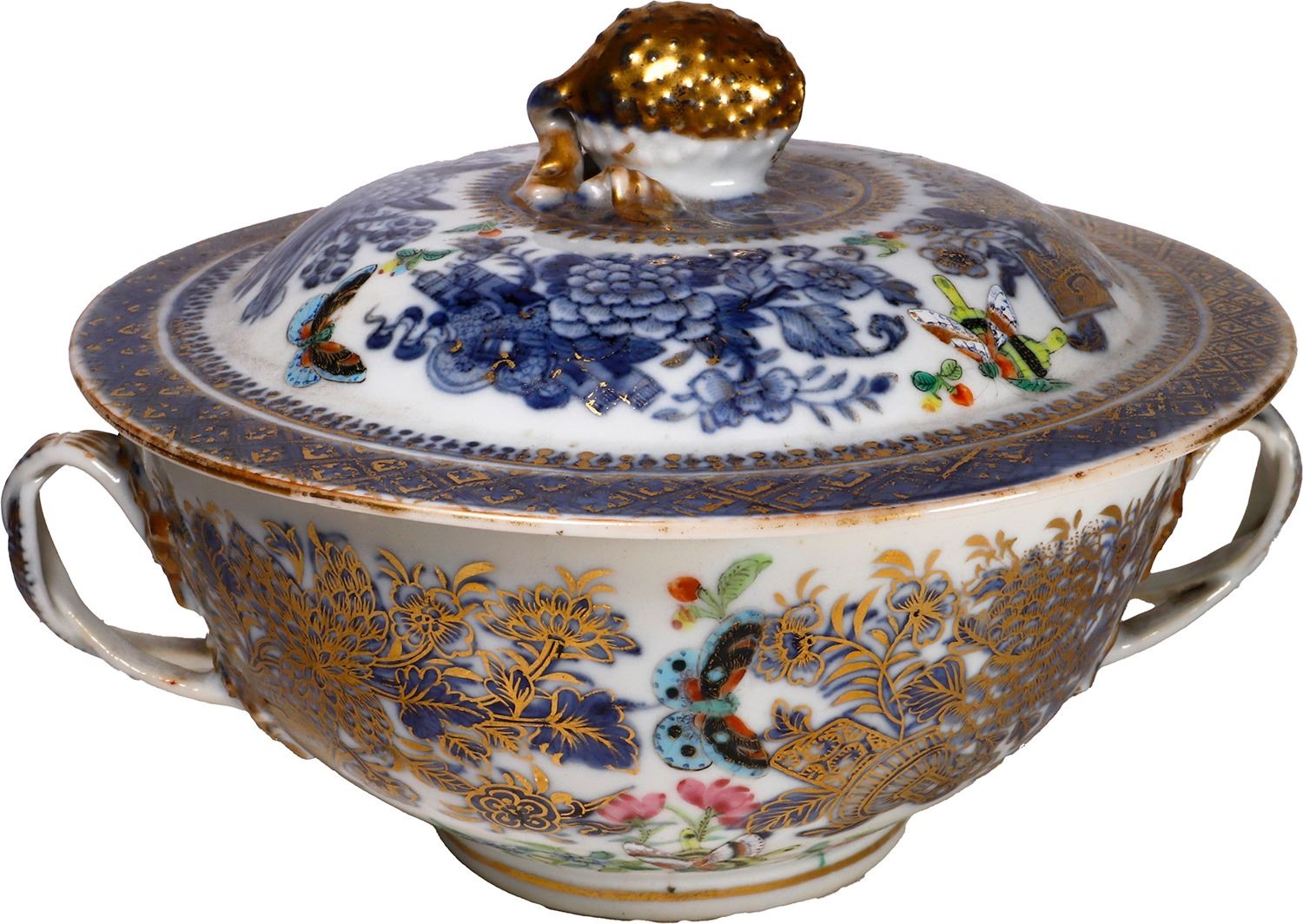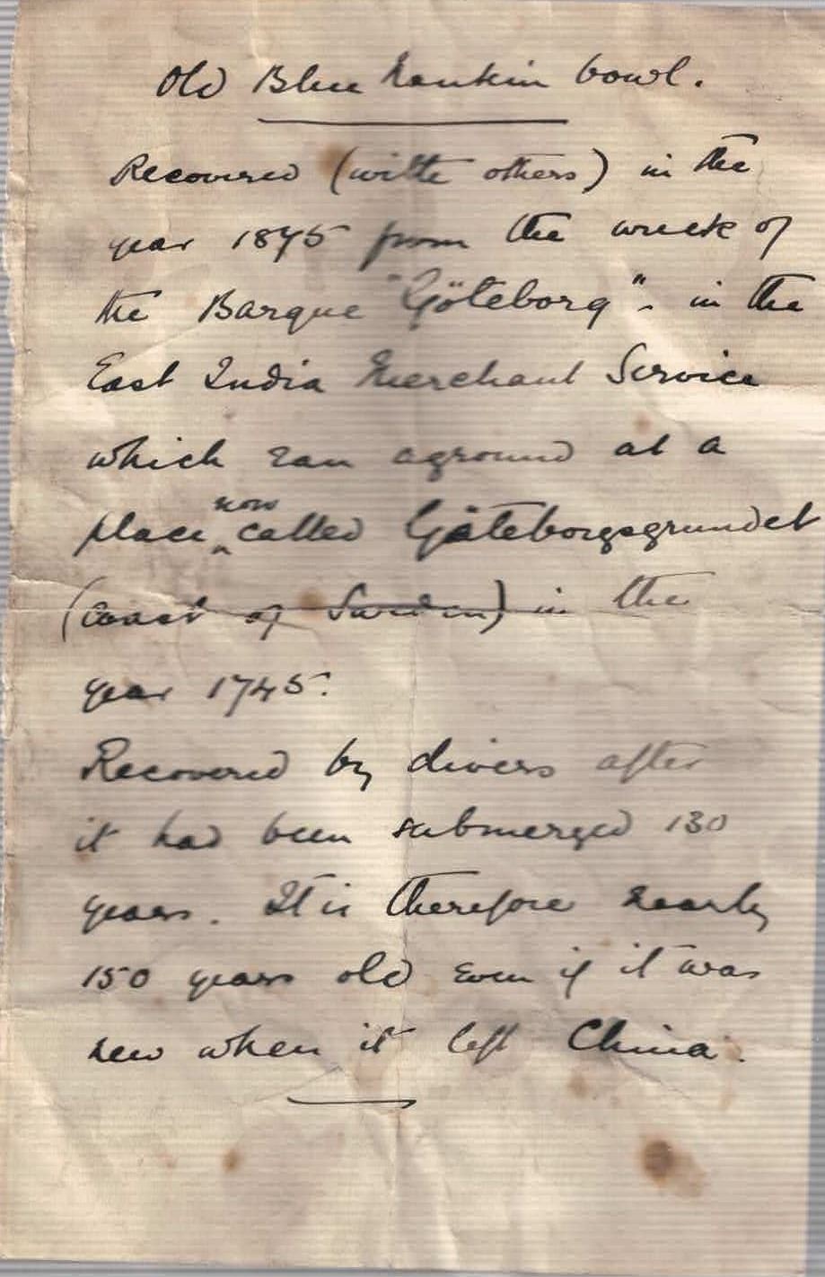Lidded Chinese porcelain bowl with original letter from ca. 1895 attesting to 1875 salvage, ex-Götheborg (1745). 637 grams total. 5" tall, 7" diameter. Impressive bowl and lid exhibiting a blue floral design under glaze with gold overlays and brightly colored enamel butterflies and flowers added, a rare intact piece from the East Indiaman Götheborg whose cargo was laden with ceramics from China. Even the accompanying letter has antique value, handwritten in cursive on aged paper, stating "Recovered (with others) in the year 1875 from the wreck of the Barque 'Göteborg,' in the East India Merchant Service which ran aground at a place now called Göteborgegrundet (coast of Sweden) in the year 1745." The letter goes on to say the artifact was "Recovered by divers after it had been submerged 130 years" (i.e., 1875) and "therefore nearly 150 years old," which establishes that the letter was written ca. 1895. Modern salvage of the ship took place in the 1980s, and a Swedish replica of the ship was launched in June 2003, but we have no evidence that any other artifacts from this wreck are in private hands. From the Götheborg, with small, handwritten letter attesting to its salvage in 1875.