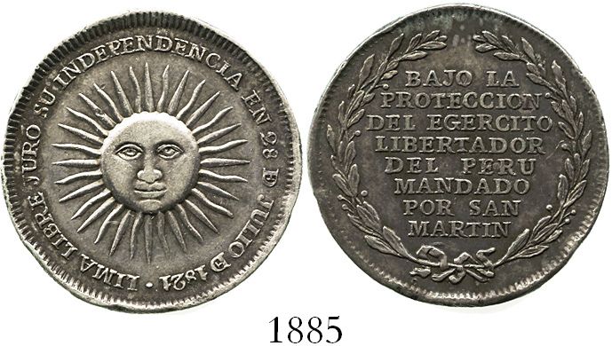 Lima, Peru, 1/2 peso-sized silver medal (jura), Independence/San Martin, 1821. Fonrobert-8998; KM-20. 10.4 grams Obverse with radiant sunface inside legend LIMA LIBRE JURO SU INDEPENDENCIA EN 28 DE JULIO DE 1821; reverse with BAJO LA PROTECCION DEL EGERCITO LIBERTADOR DEL PERU MANDADO POR SAN MARTIN inside garland wreath; well-detailed XF+ with lovely toning and underlying luster, slightly crude (bruised) rims.
