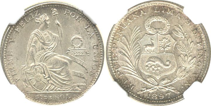 Lima, Peru, 1/5 sol, 1897VN, encapsulated NGC MS 63. KM-205.2. Superb luster, incipient toning, minimal bagmarks.