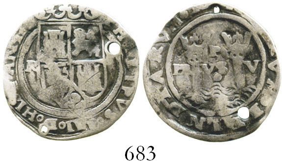 Lima, Peru, 1 real, Philip II, assayer R (Rincon), motto as PL-VS-V above dot (denomination). S-L1; KM-unlisted; CT-unlisted. 2.6 grams. Fine with flat spots but much legend and clear inner details, 2 holes near edge, toned, possibly lightly shaved long ago.