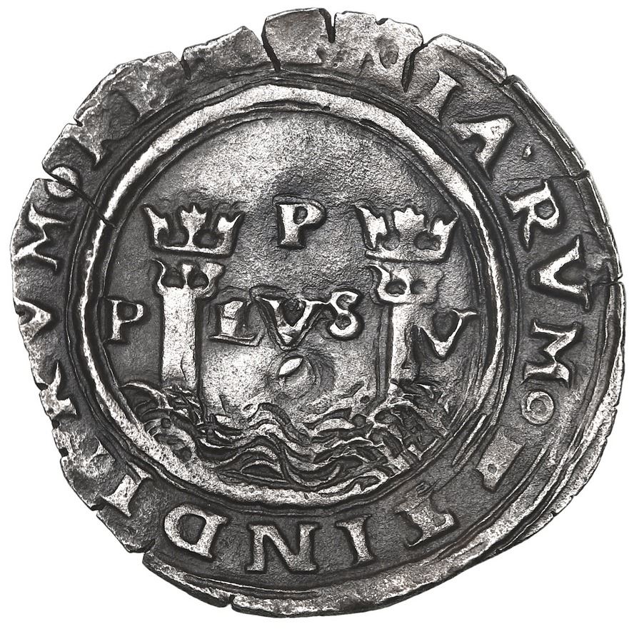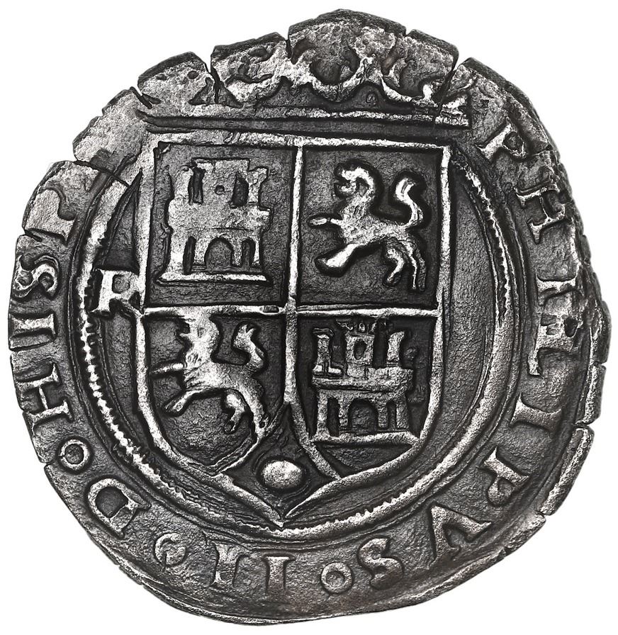 Lima, Peru, 1 real, Philip II, assayer R (Rincon) to left, motto P-LVS-V above dot, legends HISPA /