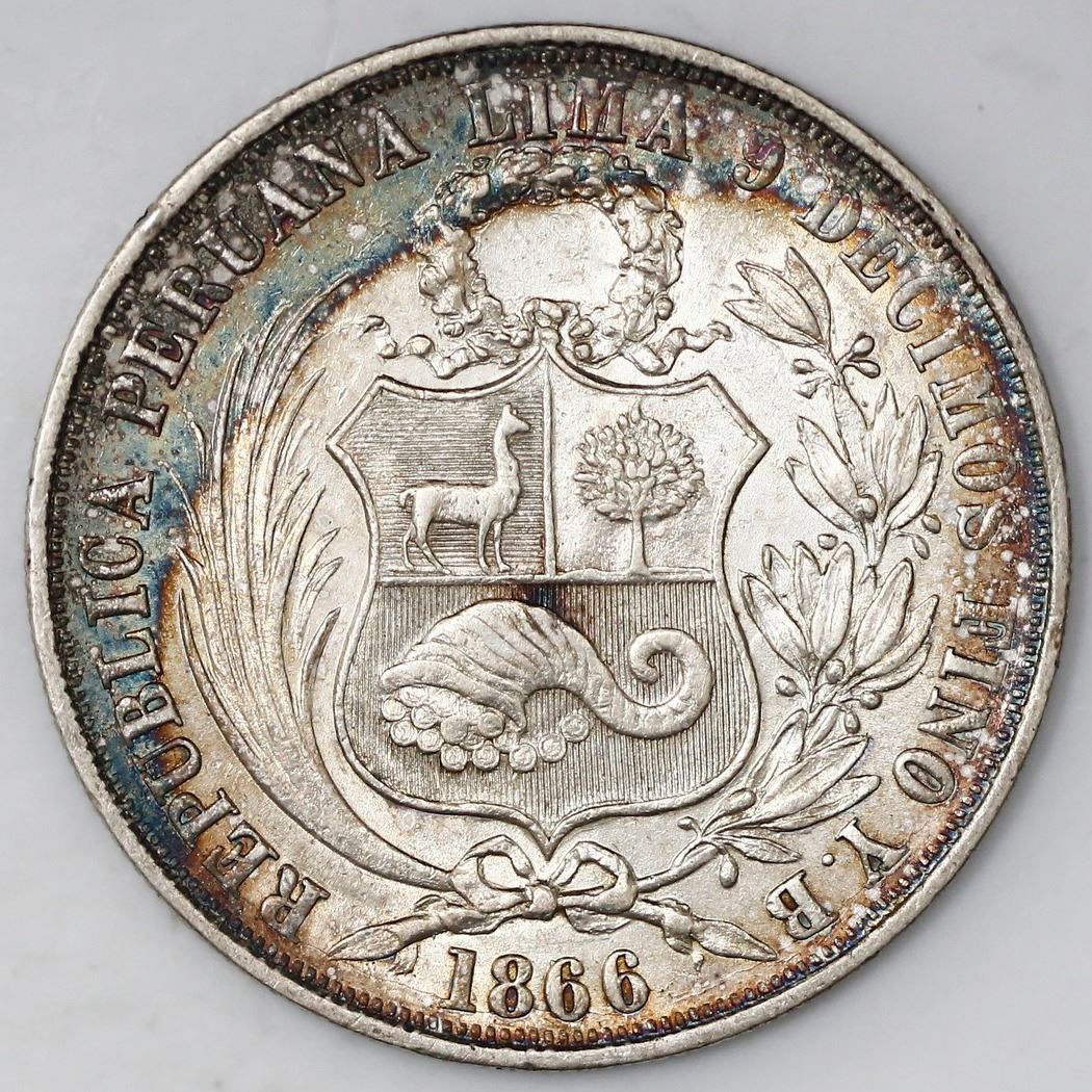 Lima, Peru, 1 sol, 1866/56YB. KM-196.1. 24.97 grams. AU, previously cleaned and now starting to tone around rims with dark rainbow colors, clear overdate details.