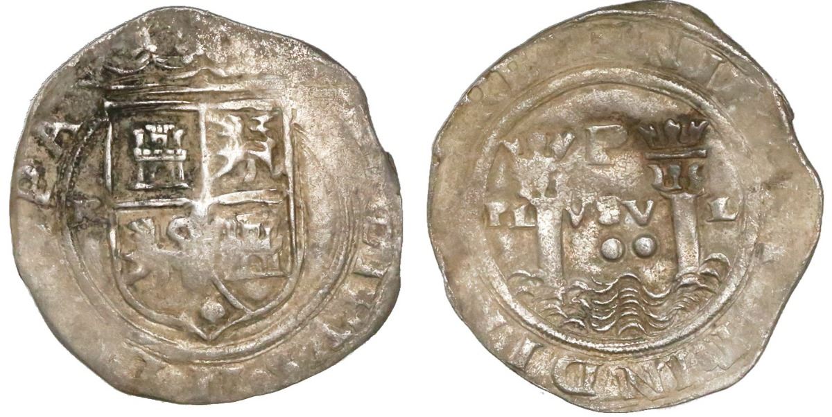 Lima, Peru, 2 reales, Philip II, assayer R (Rincon) to left, motto PL-VSV-L, legends (HI)SPA / NIA(RVM). S-L1; KM-8; CT-481. 6.67 grams. Bold pillars and most of shield despite low contrast, parts of legends flat, VF+ with traces of luster and spots of toning.