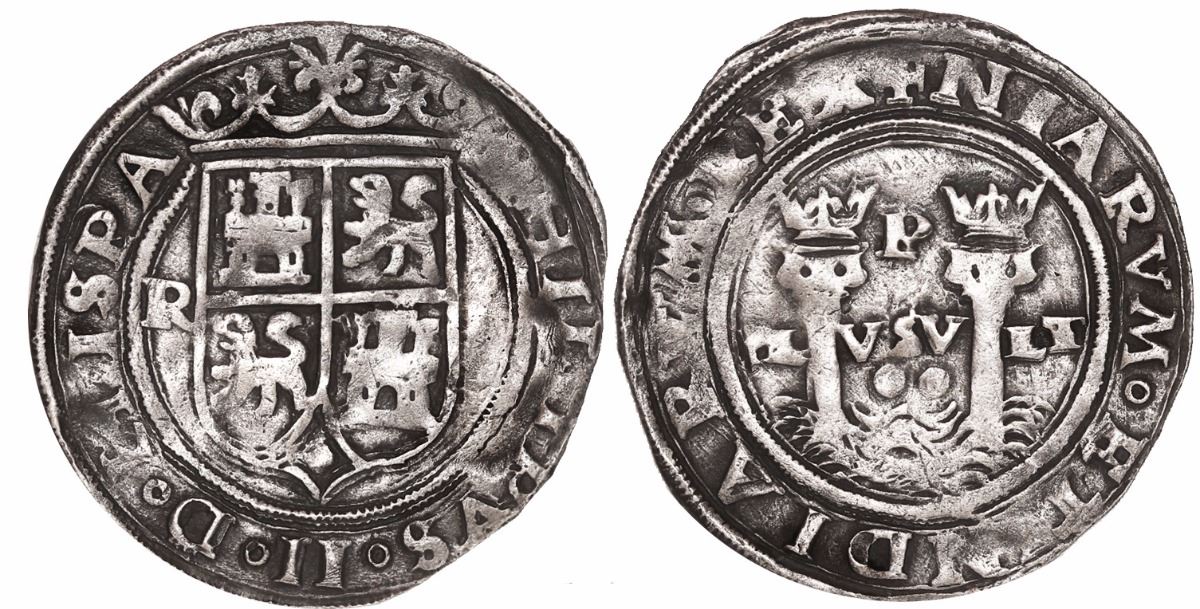 Lima, Peru, 2 reales, Philip II, assayer R (Rincon) to left, motto PL-VSV-LT, legends HISPA / NIARVM. 6.00 grams. Super-broad flan with 100% full legends and excellent inner details, nicely toned XF, very light surface porosity.
