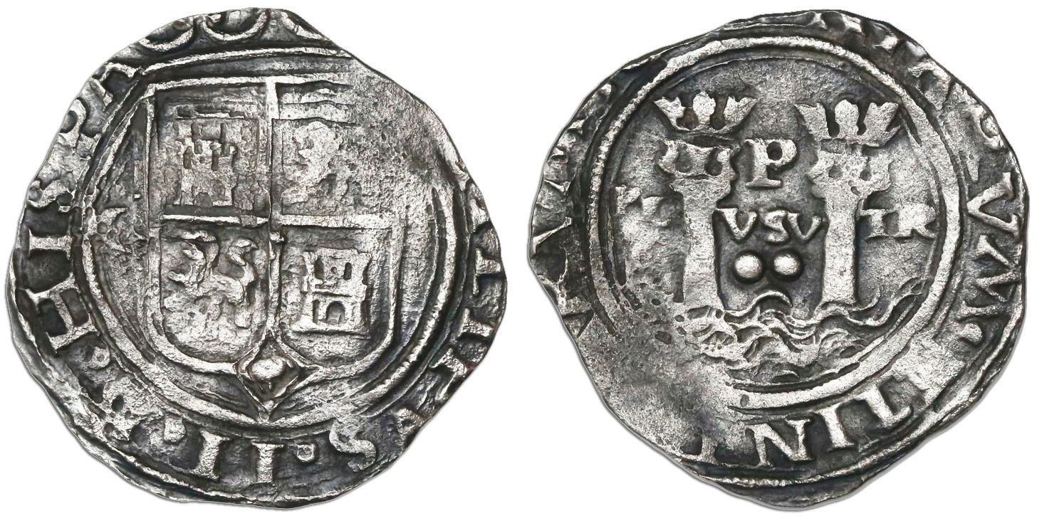 Lima, Peru, 2 reales, Philip II, assayer R (Rincon) to left, motto PL-VSV-TR, legends HISPA / NIARVM, rare. S-L1; KM-8. 6.04 grams. Bold full pillars with very prominent two-dot denomination, full but weak and slightly doubled shield above bold king's ordinal II, AXF with light surface corrosion.