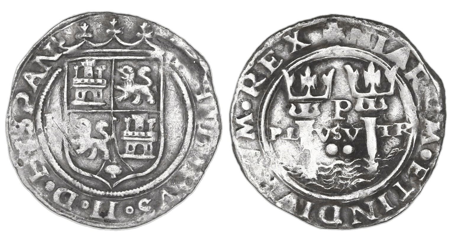 Lima, Peru, 2 reales, Philip II, assayer R (Rincon) to left, motto PL-VSV-TR, legends HISPAN / NIARVM. S-L1; KM-8; CT-479. 6.01 grams. Bold full legends and interiors except for assayer (which is weak), close to AU but with faint surface porosity, toned around details.