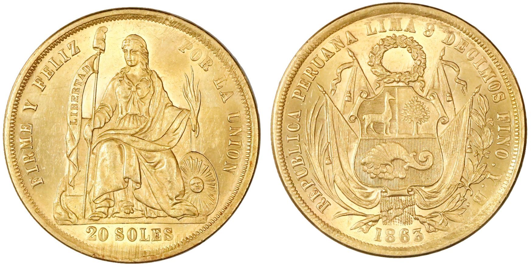 Lima, Peru, 20 soles, 1863YB,  angel wings  die-clash.