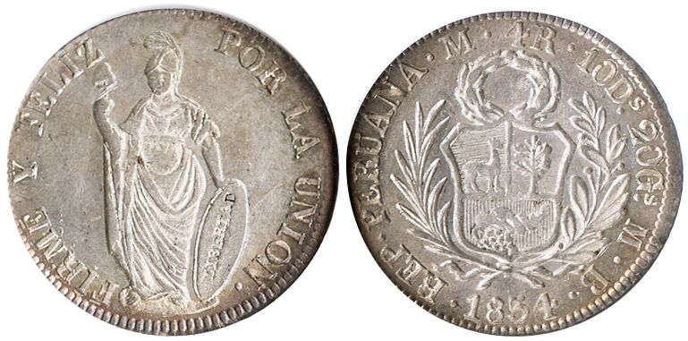 Lima, Peru, 4 reales, 1854MB, encapsulated NGC MS 62. KM-151.3. Choice luster, nice (albeit slightly off-center) strike, and also a scarce date, much nicer than most but in the company of 6 Mint States in the NGC census, same grade as the Whittier specimen.