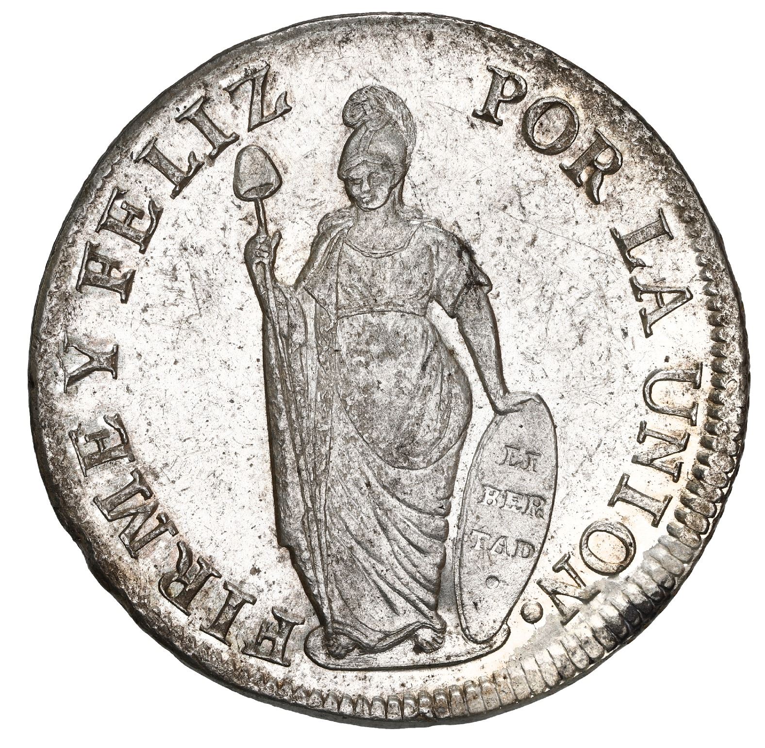 Lima, Peru, 8 reales, 1828 JM, large Liberty, NGC MS 62. KM-142.3. 25.36 grams. Brilliantly lustrous, with sharp full details but slightly uneven rims due to centering issues, rough spot on llama in shield (as made), impressively flashy for the grade. NGC #5965629-002.