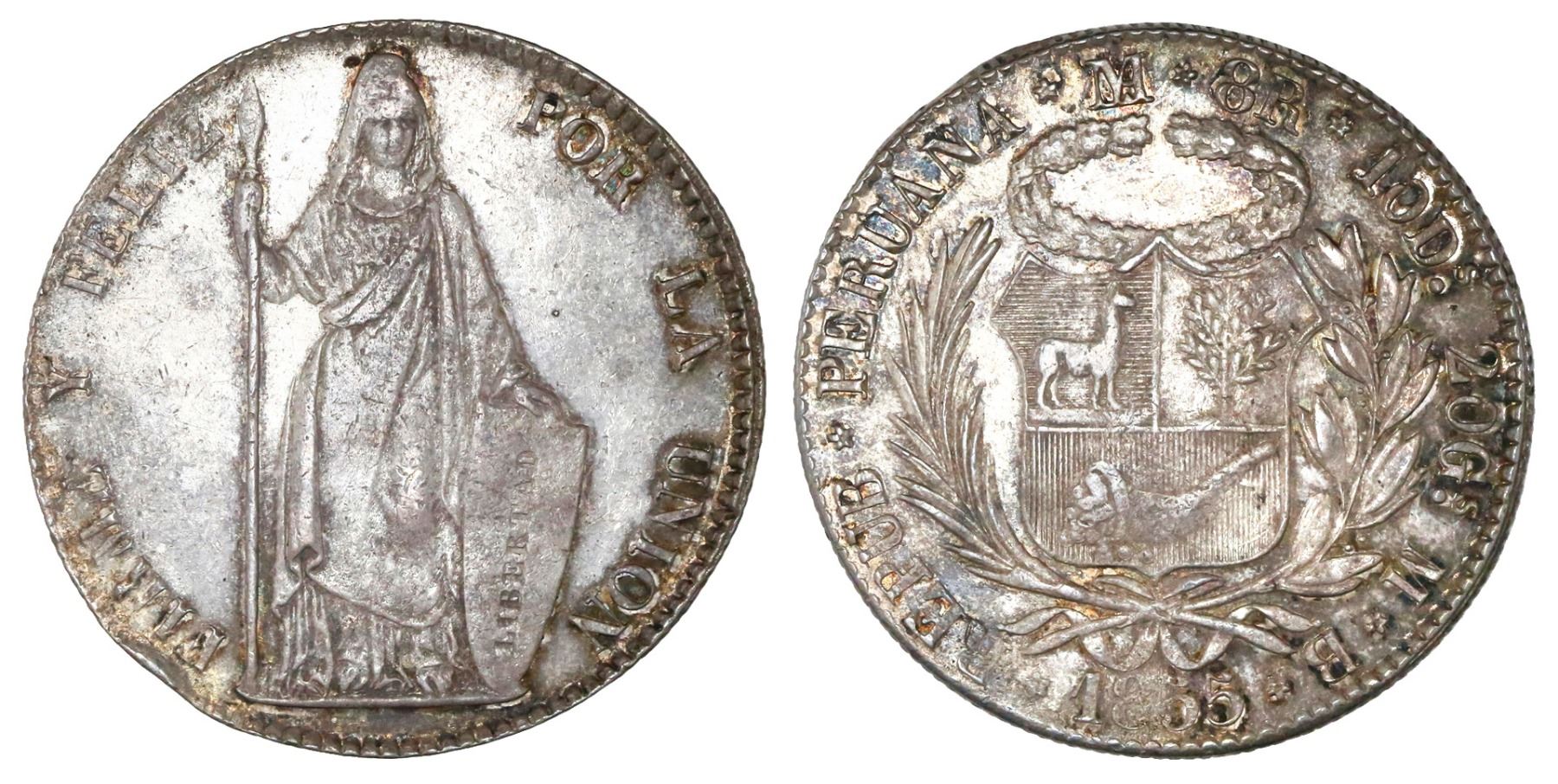Lima, Peru, 8 reales, 1855MB, NGC AU details / cleaned. KM-142.10a. Lightly toned all over with golden color and luster in legends, slightly weak centers, lighter fields indicative of cleaning but a net grade of XF 45 might be more accurate. NGC #4724466-005.