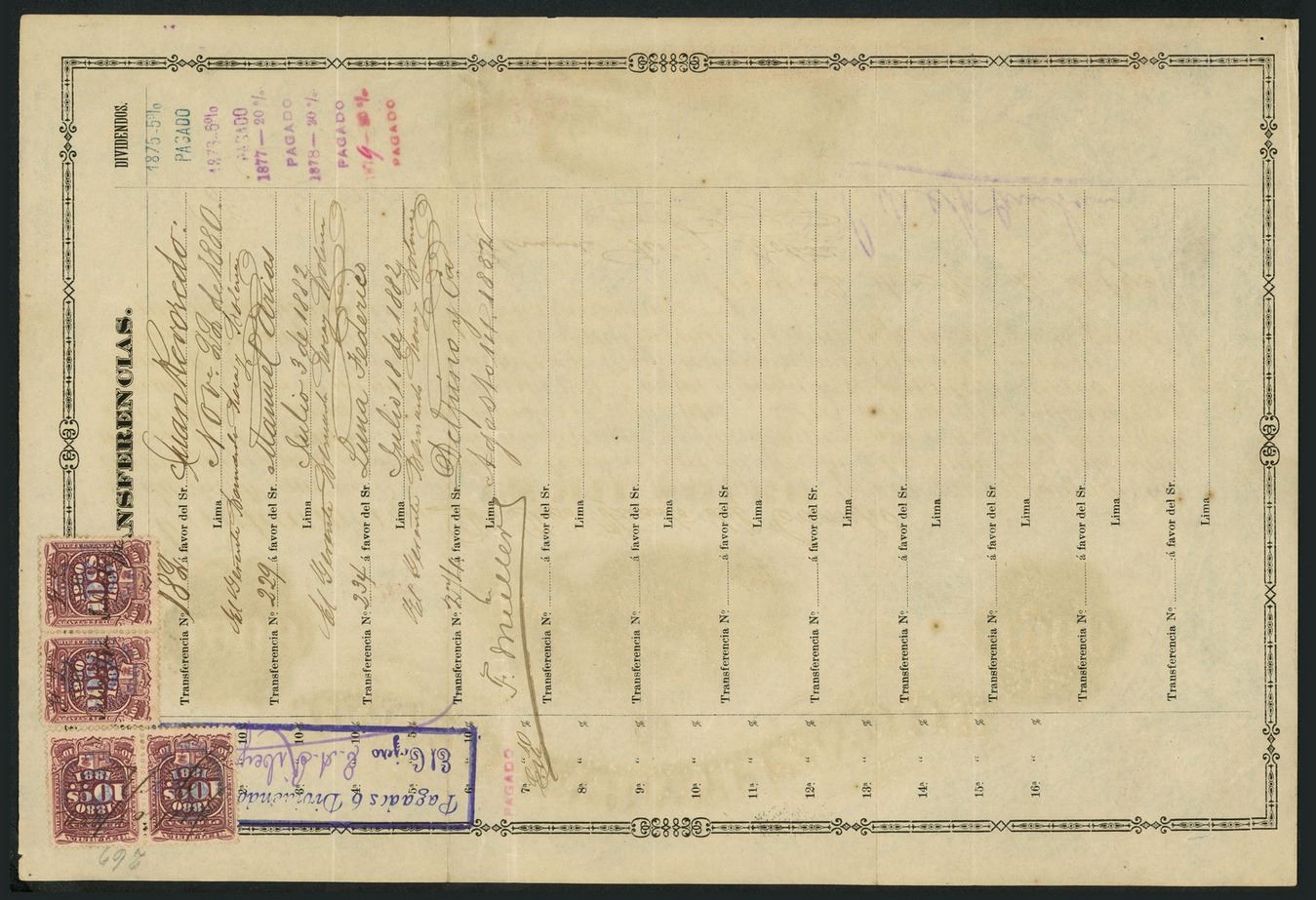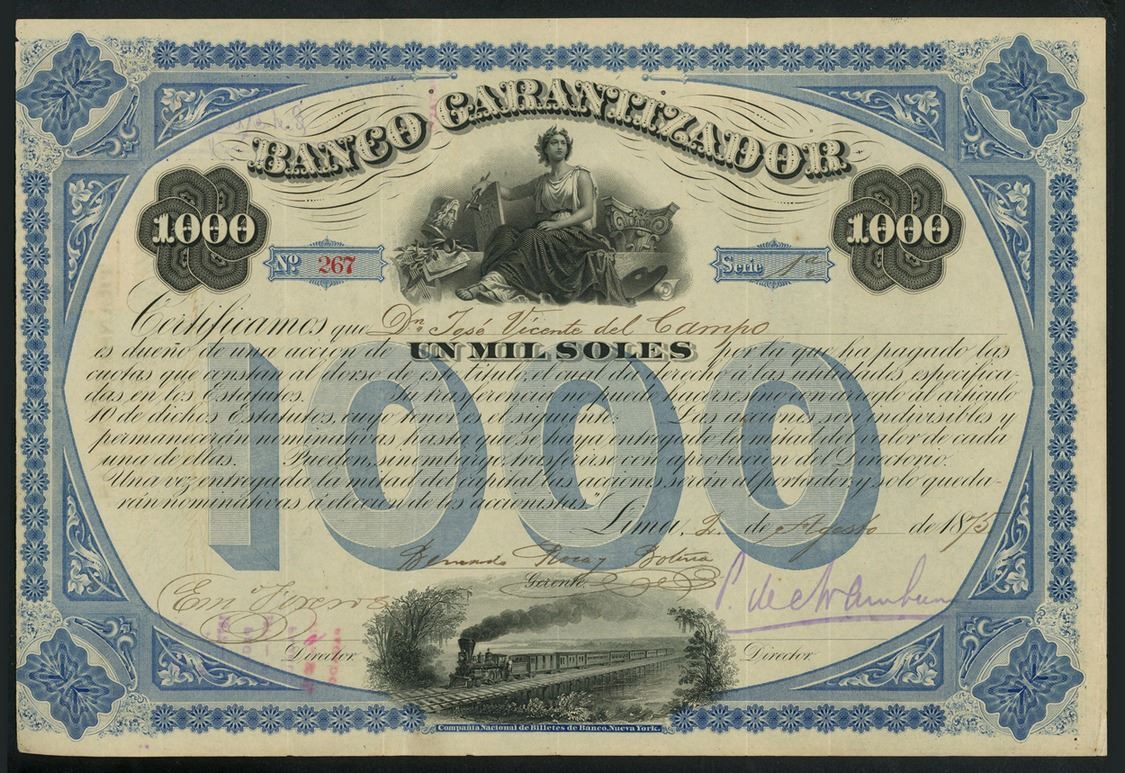 Lima, Peru, Banco Garantizador, 1,000 soles bond, 2-8-1875. Series 1, serial 267. Well preserved bond initially issued to a Jose Vicente del Campo, with a number of interest payment and transfers noted on the reverse.