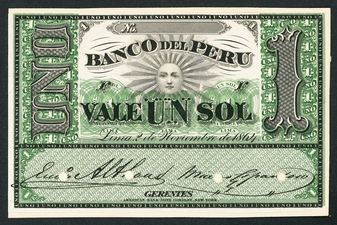 Lima, Peru, Banco del Peru, sol front proof, 2-11-1864.