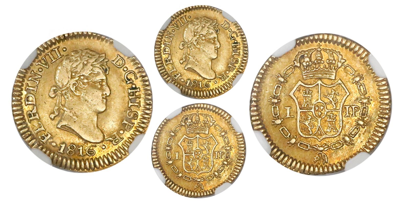 Lima, Peru, bust 1/2 escudo, Ferdinand VII, 1816JP, NGC AU 53. CT-353; KM-125. Bold strike, lightly toned over luster, broad flan with metal extending past rim in places, second finest known in NGC census. NGC #3834263-055.