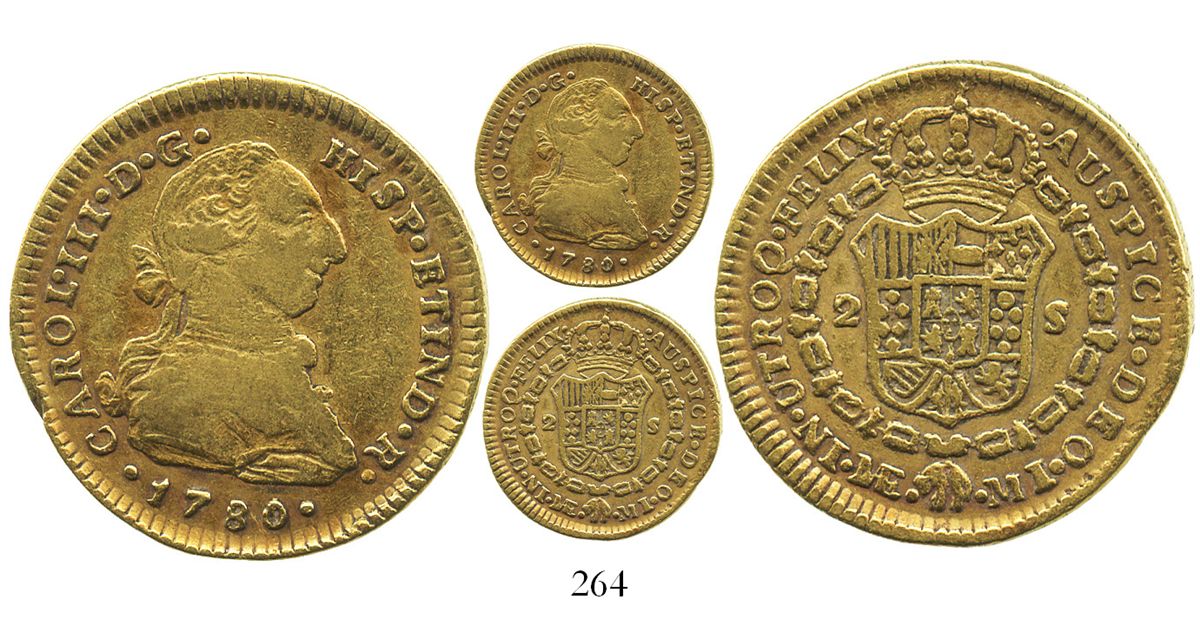 Lima, Peru, bust 2 escudos, Charles III, 1780MI, rare. KM-80; CT-434. 6.6 grams. Broad-flan AXF with toning and sediment around details, minor edge-flaw (as made), rare assayer for the date and of a generally scarce type.