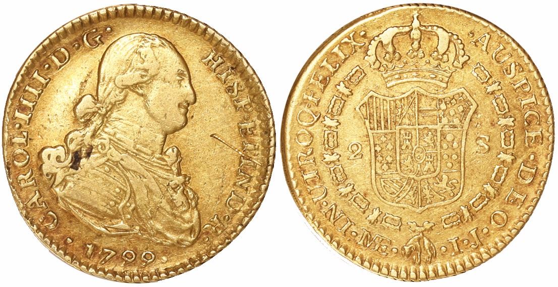 Lima, Peru, bust 2 escudos, Charles IV, 1799IJ. CT-314; KM-100. 6.68 grams. Lightly red-toned XF+ with scratch in front of face.
