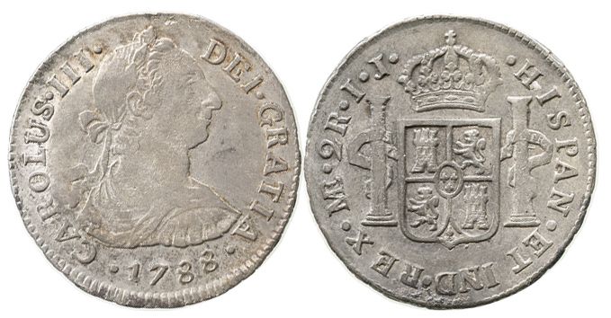 Lima, Peru, bust 2 reales, Charles III, 1788IJ. KM-76a; CT-1286. 6.5 grams. Lustrous AVF with light golden toning all over.