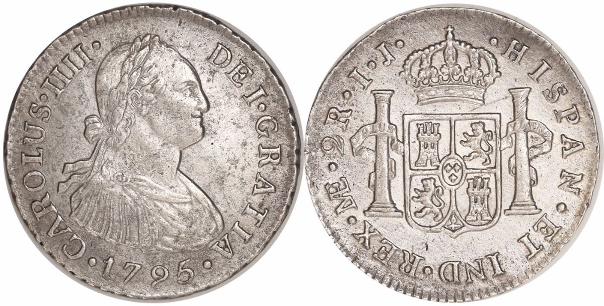 Lima, Peru, bust 2 reales, Charles IV, 1795IJ. 6.63 grams. Boldly well-struck AU+ with matte surfaces (no luster), old scratch below crown.