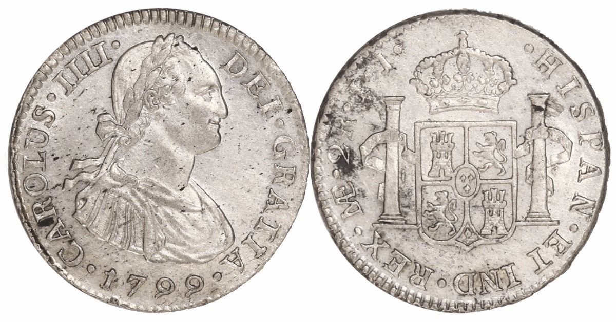 Lima, Peru, bust 2 reales, Charles IV, 1799IJ. 6.66 grams. Lustrous UNC with light surface hairlines on obverse only, incomplete rims.