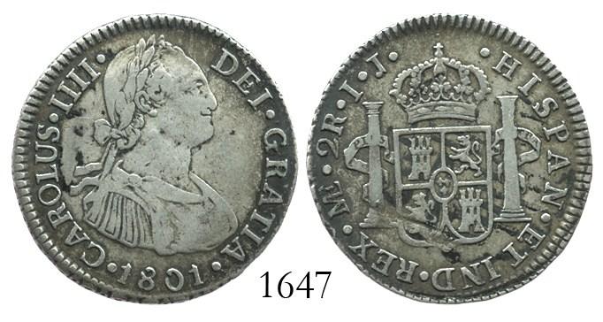Lima, Peru, bust 2 reales, Charles IV, 1801IJ. KM-95; CT-948. 6.6 grams. Richly toned VF with old scratch at bottom of shield, slightly off-center strike. Pedigreed to the Mark Bir collection.